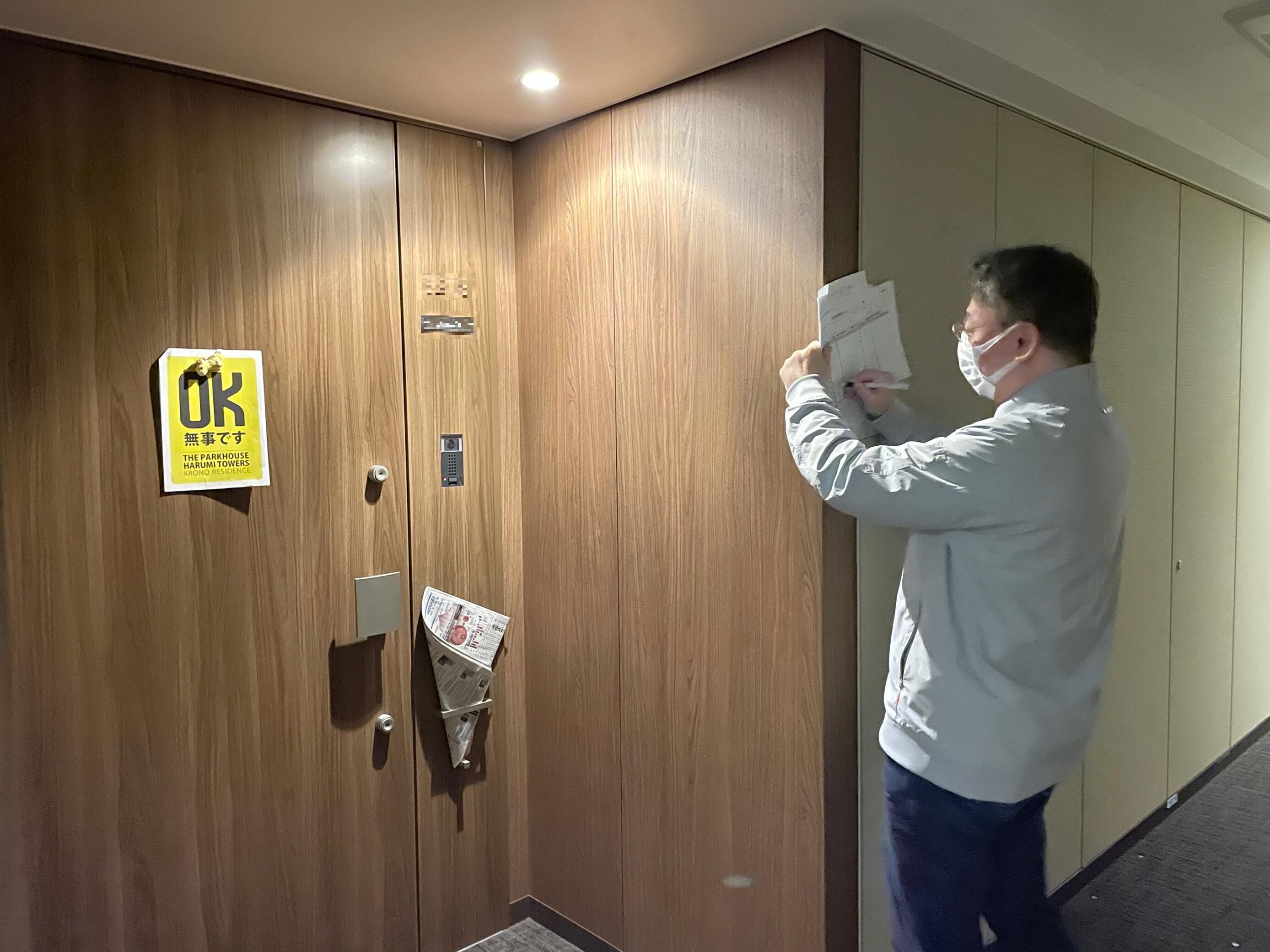 安否確認シートを住戸の扉に貼り出し、あらかじめ定めた居住者の担当者が巡回して、安否確認情報を収集します。災害時に停電してしまうとエレベーターが使えず、タワーマンションは上下移動が特に困難となります。そこで、「各階対策チーム」を設けブロック毎に水平移動で効率的に活動するため、各フロアーの住戸を確認し本部に報告する一連の流れを訓練しました。そして、最後に2物件で安否確認を共有し、情報連携を行いました。