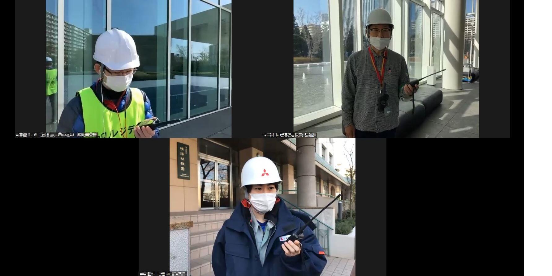 タワーマンションならではの困りごとの1つでもある「停電の際エレベーターが使えないことを想定」し、10ℓのウォータータンクに水を入れ実際に高層階まで運ぶ訓練や、ザ・パークハウス 晴海タワーズの各マンションと、公的避難所となる小学校の3箇所から無線機を使って情報を共有することを想定し、その中継を交えながらオンライン訓練を実施しました。また、2物件合同で開催することから、「情報」「食糧」「運営」をテーマに、被災生活を「助け合い」で乗り越えた事例を紹介し、チャットやアンケート機能を活用しながら参加者と具体的な行動を考えました。