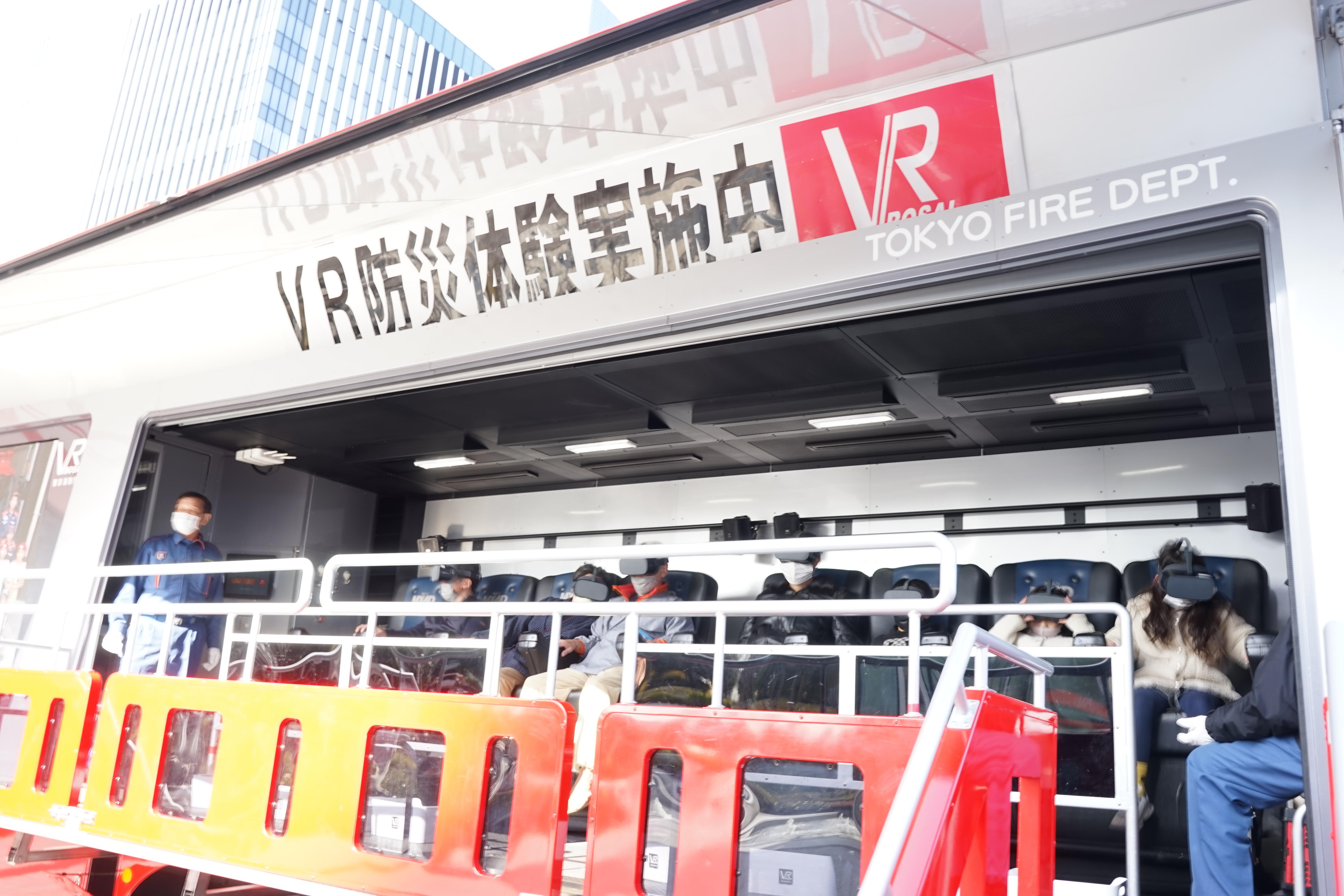 水消火器による初期消火訓練と煙ハウスでは火災時に煙が発生してしまった場合の避難方法などを体験しました。また、「VR防災体験車」では、360°の立体映像と揺れ・風圧・熱などの演出による、地震・火災・風水害の疑似体験を行いました。
