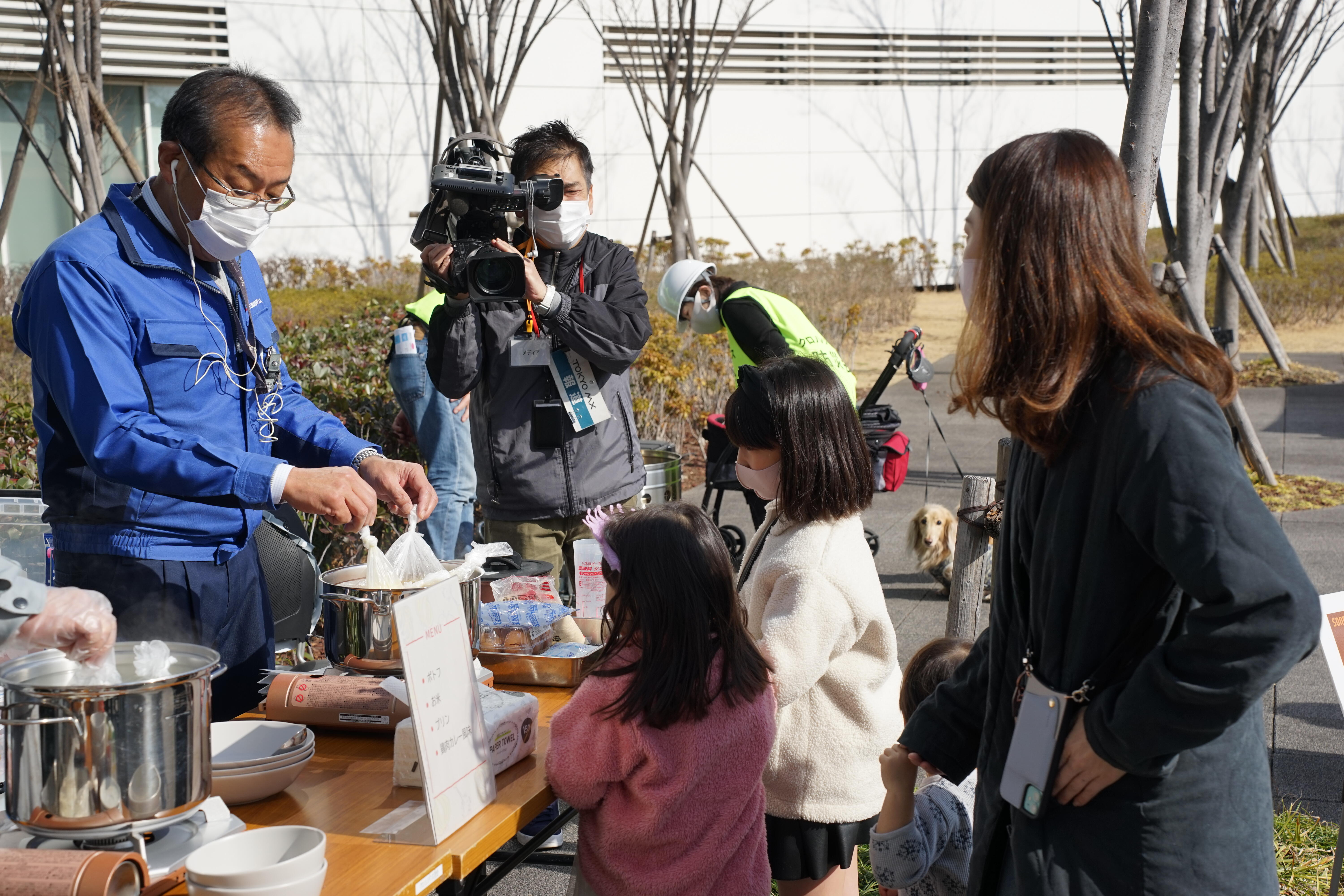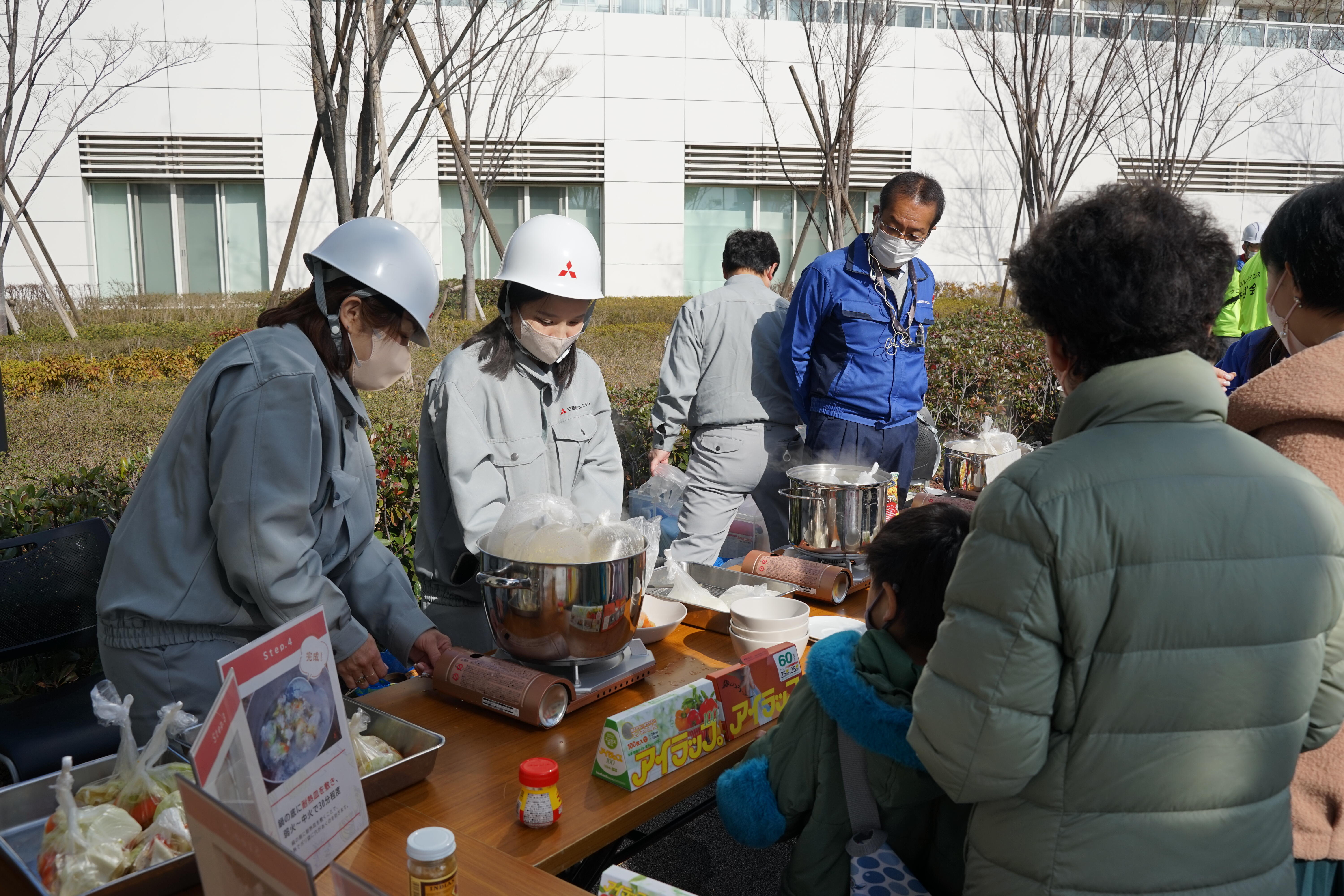 「食材を出し合ってご近所同士でバーベキューをした」という東日本大震災の被災地の声を基に、湯煎可能なポリ袋を活用した炊き出しを行い、食事を作りました。災害時に貴重となる「水」を繰り返し使用することができ、ポリ袋で1人分を作るためアレルギー対応等にもなる炊き出しのノウハウを学びながら新たな備えに繋げました。また、マンションの防災倉庫に備えている防災釜をお披露目し、豚汁の炊き出しも行いました。
