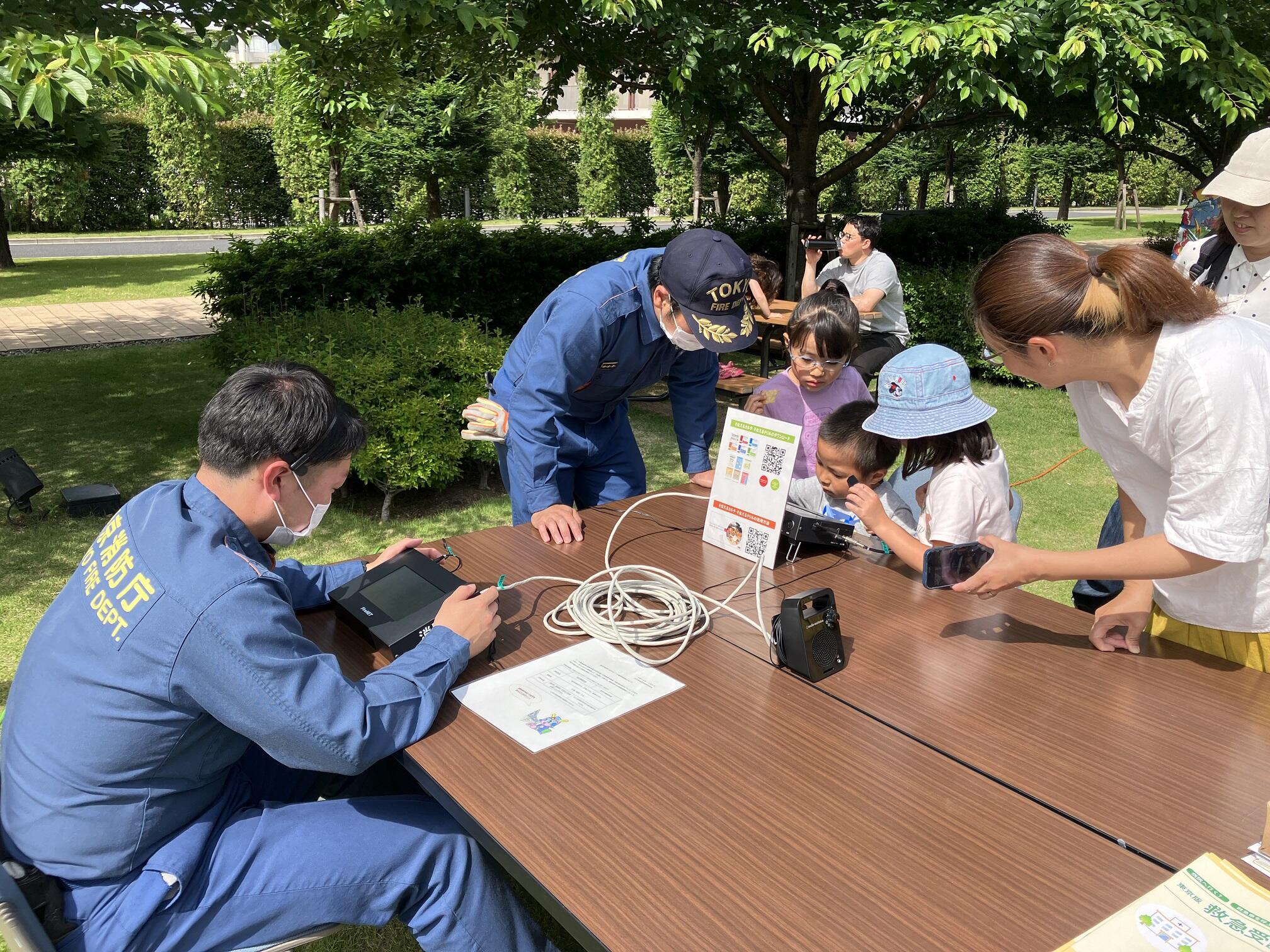 「三菱地所グループの防災倶楽部」と三鷹市・三鷹消防署・NPO法人Mitakaみんなの防災が協働し、防災ブースにて体験会を実施。親子が家族を想定して考える防災ツール「そなえるドリル」を使ったワークショップで備えを考え、三鷹市のハザードマップの確認と三鷹市防災マップで自宅周辺の避難所等を把握しました。ワークショップで災害時のトイレの備えを考える中で、三鷹市が備えていて期限が切れてしまった「簡易トイレ」を上手く活用し、互いに持っているノウハウを提供することで防災の備えを地域に広げることができました。三鷹消防署とは、緊急時に落ち着いて行動できることを目指し、119番通報訓練を実施しました。また、自宅にある身近なツナ缶を使った簡易ランプづくり体験も実施し、参加者からは「最近引っ越してきたので、避難所の場所を知ることができて良かった」「ツナ缶でランプが作れることを知らなかった。日頃から備えたいと思った」「凝固剤を実際体験することもでき、具体的な備えの個数も確認できたという声がありました。