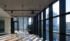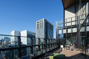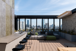 各オフィスフロアの専有部には「インナー・アウターバルコニー」が配置されています。インナー・バルコニーは室内外をゆるやかに繋ぎ、室内でも屋外にいるような空間を提供、東西両面に配した2~3 層吹き抜けの開放的なアウターバルコニーは天井高7m~11m、奥行4mと広く整備され、ワークスペースの延長にあるゆとりの空間を実現しています。専有部に限らず、屋上には就業者が自由に利用できる空間として、テナント専用の「ルーフトップテラス」を整備。キッチンカウンターが配置され、業務や仕事以外の多目的な用途としても利用が可能です。