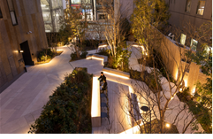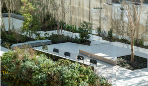 また、オフィスビルの1階には外苑西通りから青山通りへと抜ける緑豊かな「ポケットパーク」を配置しております。敷地内には什器を設置しており、地域の方の憩いの場やワークスペースとしてもご利用いただける他、外苑西通りと青山通りを繋ぎ、南青山三丁目交差点を中心とする回遊性へ発展するような、歩いて楽しいまちづくりを目指しました。