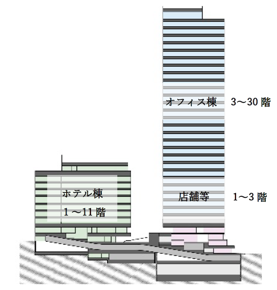 ホテル棟 地上11階、地下2階、塔屋1階・高さ約60m
