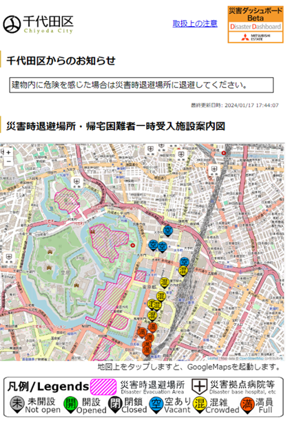 千代田区が従来から展開している「災害時退避場所案内図」(PDF版)をベースに、帰宅困難者等一時受入施設(リアルタイム)と千代田区・災害対策本部からのメッセージを掲載したデジタルマップを開発。