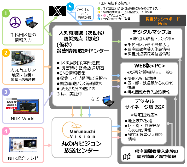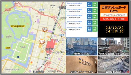 「災害ダッシュボード」実装は、丸の内エリアにおける帰宅困難者に対して情報提供するDXとして、避難者が自ら避難・移動先を選択することで、避難者の過度な集中を避けて平準化を狙うもので、また鉄道事業者にとっても乗客等への案内する上で期待される取り組みです。当社では、現在丸の内エリアの15棟で千代田区と帰宅困難者等一時受入施設の協定、医療機関と医療連携の協定なども締結しており、更なる災害対策ニーズとソリューションとして、災害ダッシュボードの次期新機能検討・実証を引き続き続けながら、千代田区と連携して推進してまいります。