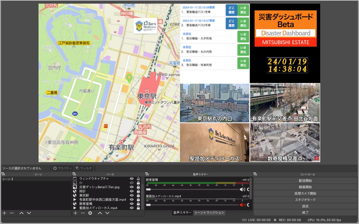・災害時の丸の内エリア内のローカル放送局((仮称)災害情報放送センター)を想定し、デジタルマップによる俯瞰情報(システム画面)と、東京駅などの周辺俯瞰ライブカメラの情報と編成し、放送(再送出)する「ライブ映像編成装置」により連結し、ライブ配信を行う実証。
