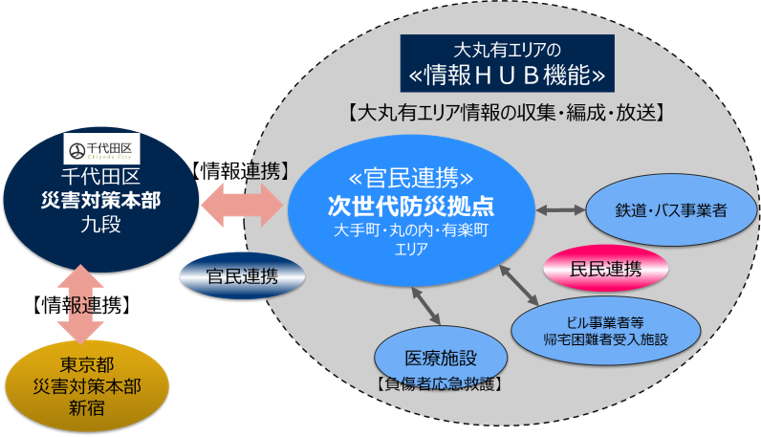 「都市再生安全確保計画(前述※1)」において定義している、丸の内エリアの災害対策を更に充実させることを企図した災害対策拠点。同拠点に含まれる「情報HUB機能(前述※2)」は、帰宅困難者等一時受入施設や避難者情報の一元管理、負傷者搬送支援などの災害時の官民・民民情報共有プラットフォームの構築を想定している。また、平常時には災害対策機関の交流を促進するコミュニティ機能を有するほか、エリア防災訓練なども想定している。