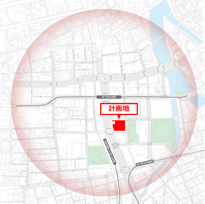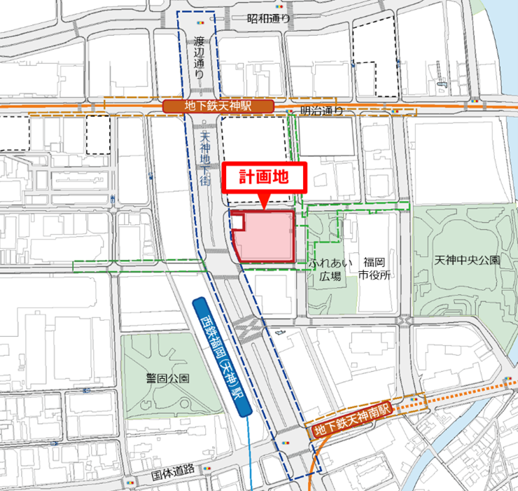 本計画は、福岡市が推進する天神ビッグバン※1に貢献し、情報受発信基地であったイムズ※2跡地に相応しい開発となるよう、地域に開かれた新しい滞在・交流空間を提供するとともに、時代の変化に応じた新たな文化・ライフスタイルを創出し続けることを目指します。