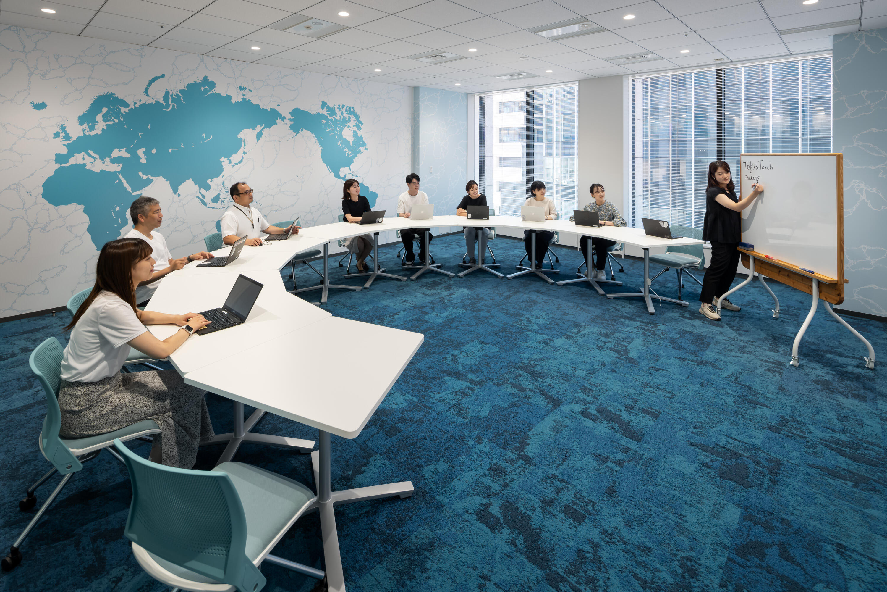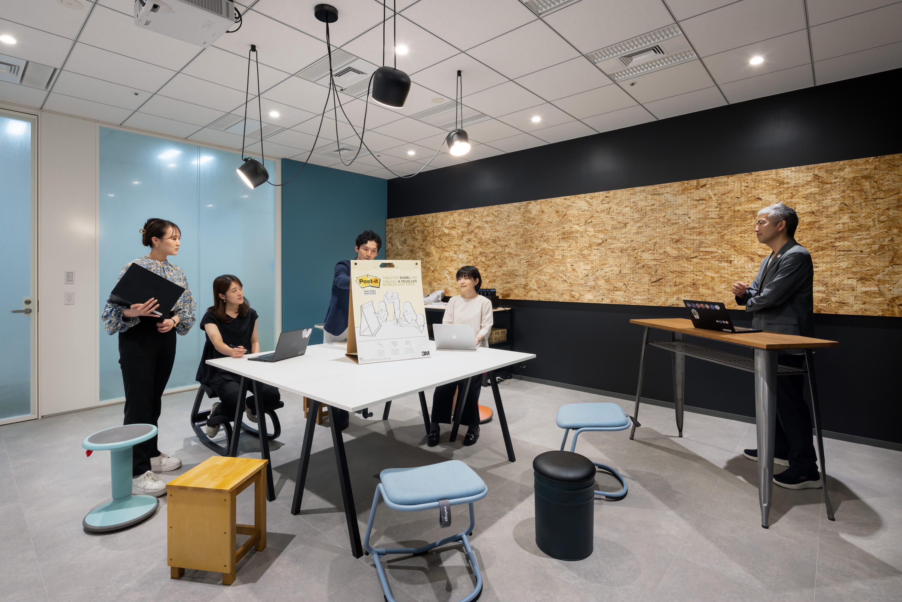 - 半数の部屋は什器を可動式にし、対面会議ならではの人の動きを創出、意思疎通を容易に