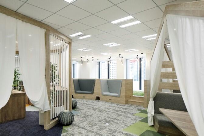 - 「WELL-BEINGな環境でリラックスして働くことで、柔軟な発想を生み出す」ことを狙い、BGM・グリーン等を配置、生体リズムが整うよう自然光の周期を自動で再現する「サーカディアン照明」を導入