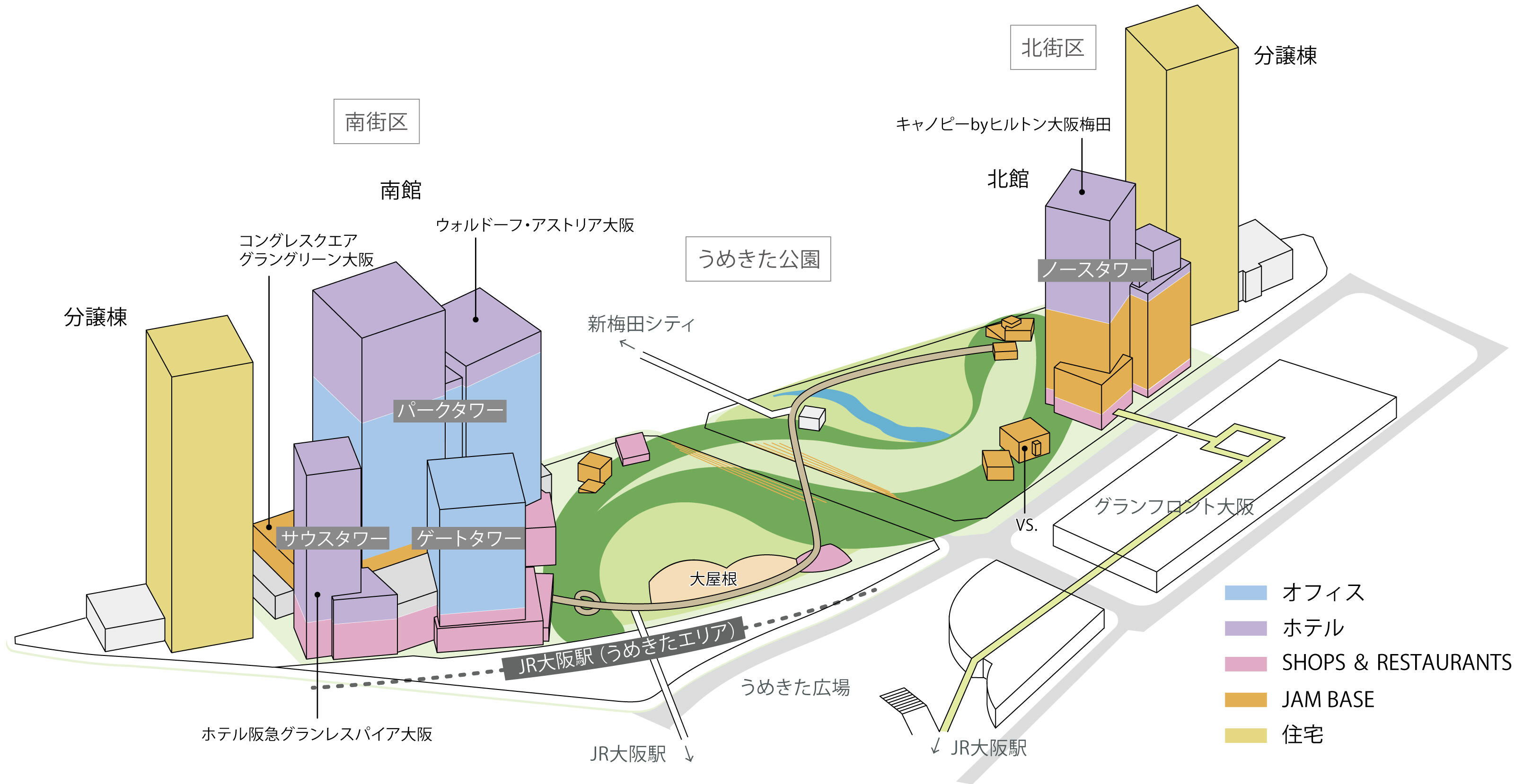 本プロジェクトは、西日本最大のターミナル駅「JR大阪駅」前に、約45,000㎡の面積を誇る都市公園「うめきた公園」、オフィス、ホテル、商業施設、中核機能施設、分譲住宅などを整備するプロジェクトです。事業者JVは当初より公園と民間敷地を一体的にデザインし、開業後も事業者JVの組成する「一般社団法人うめきたMMO」(以下「MMO」)がうめきた公園指定管理者として50年にわたりパークマネジメントとエリアマネジメントを行うなど、事業者JVが中心になって一体的に運営・管理してまいります。