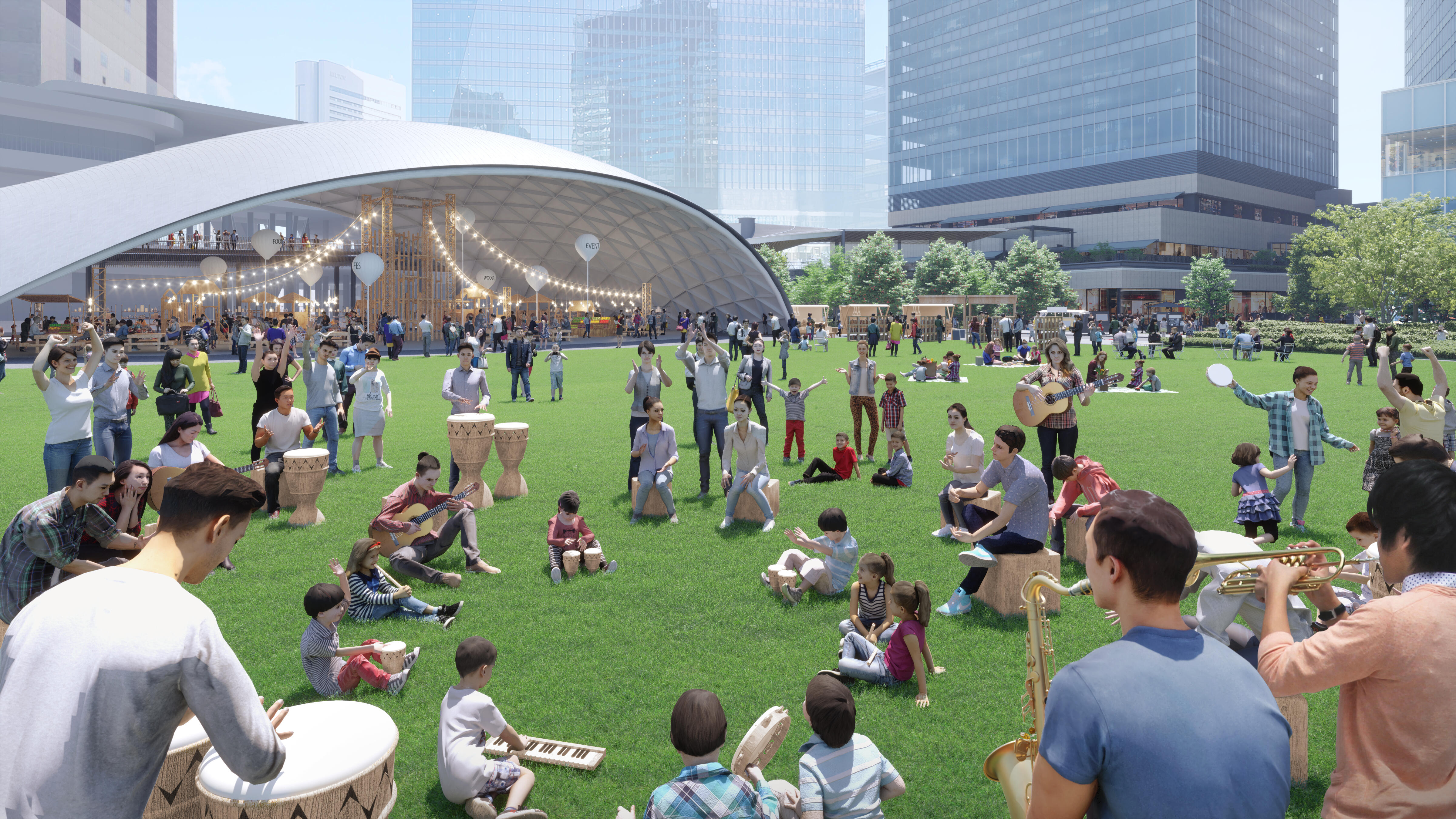 私たち事業者JVは、グラングリーン大阪の開発の企画に際し、このまちを訪れる方が前向きになれるまちであること、このまちでの出会いを通じてより良い社会を創っていきたいとの想いを持っていました。そのため、世界有数の大規模ターミナル駅前に約45,000㎡もの大規模で高質な都市公園をつくることを公民連携の枠組みの中で決め、公園を中心とする圧倒的なみどりに包まれた空間や多様なアクティビティが生まれる大規模複合再開発を計画しました。
