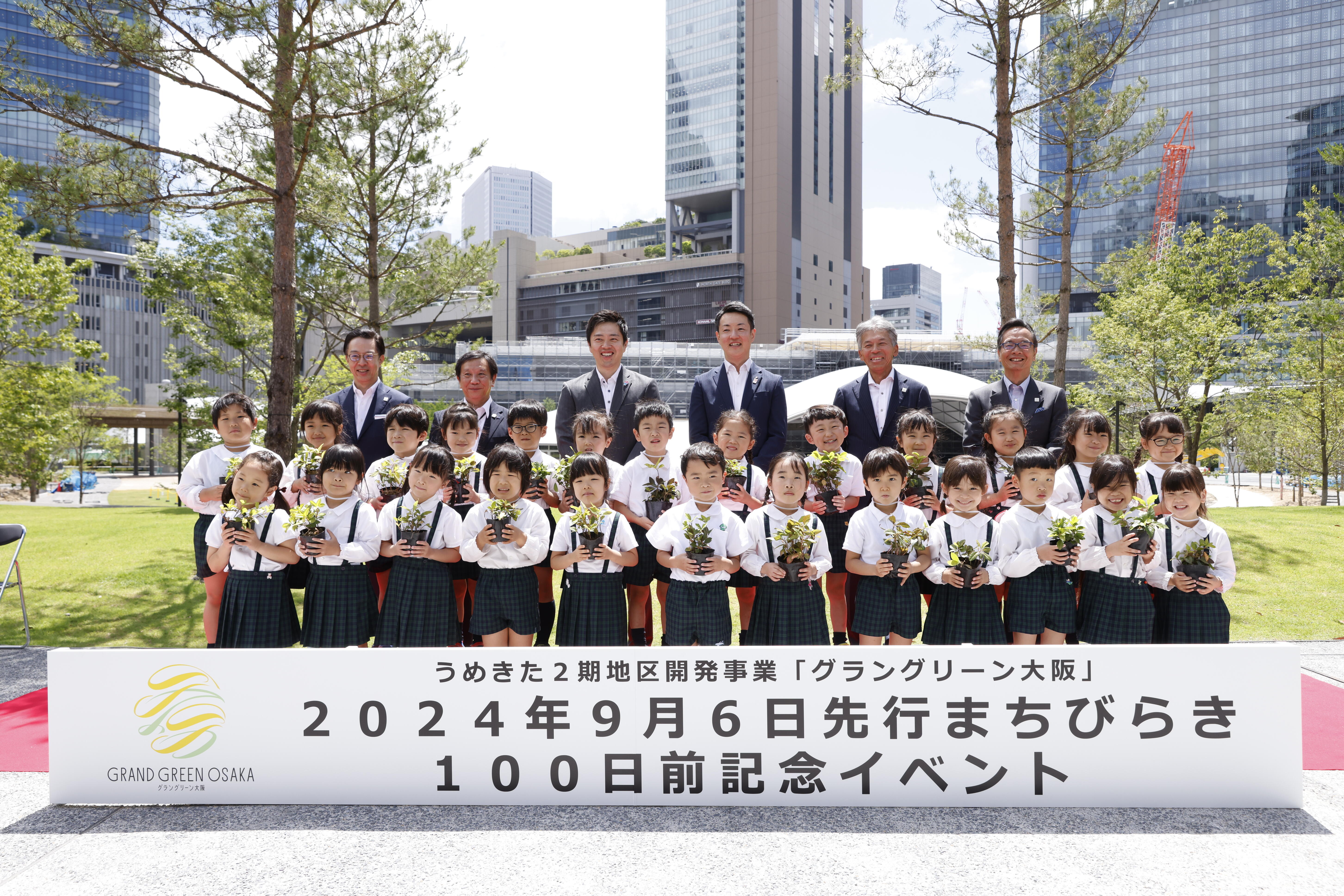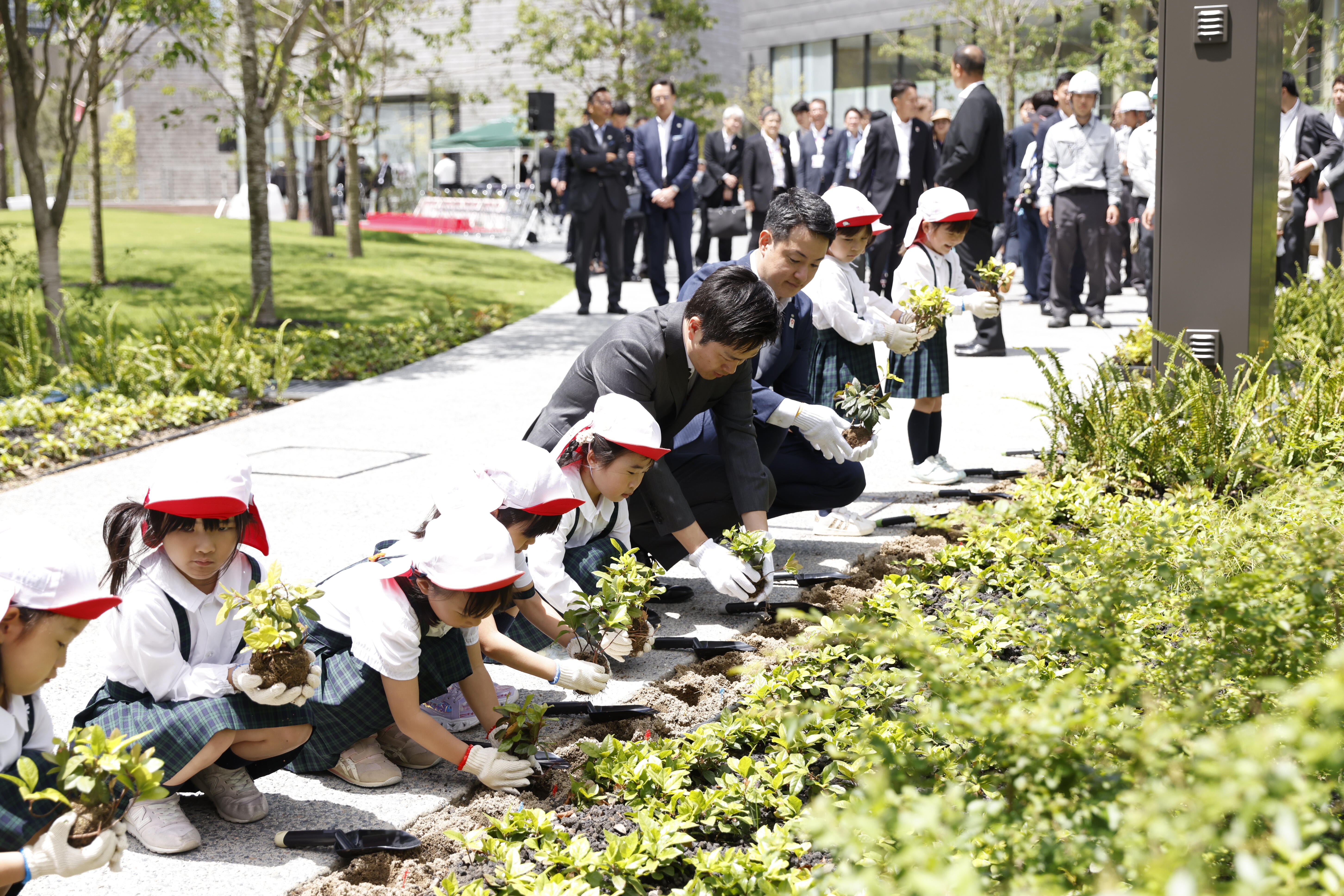 また、本プロジェクトは、大阪府・大阪市、独立行政法人都市再生機構(以下「UR都市機構」)とともに取り組んでいる公民連携のプロジェクトです。本日、先行まちびらき100日前を記念して大阪府・大阪市、UR都市機構と共催で地域の未来を担う近隣園児とともに植樹セレモニーを行いましたので、併せてお知らせします。