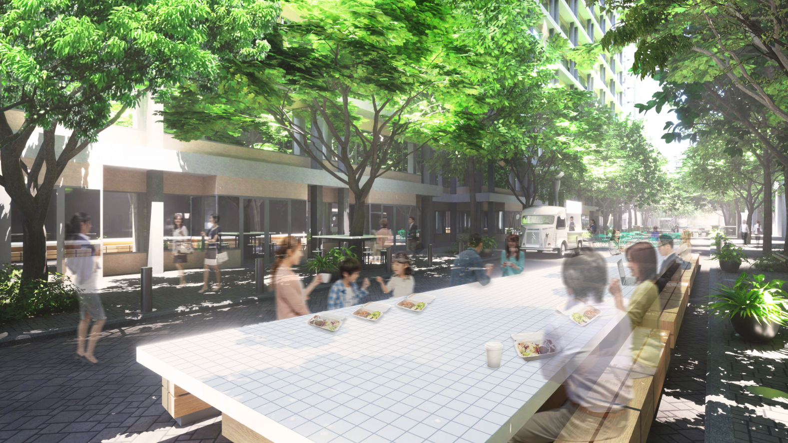 丸の内仲通りの直線を活かしたロングテーブルや、歩車道部分を一体的に活用したベンチカウンターを設置。ワークスペース・ランチスペース・友人との談笑等、1人でも複数人でも訪れた人次第で過ごし方が変化する空間を創出します。レンタル木材を使用したベンチを設置し、会期終了後は丸の内仲通りを離れ様々な製品として再利用されるSDGsな取り組みにもチャレンジします。