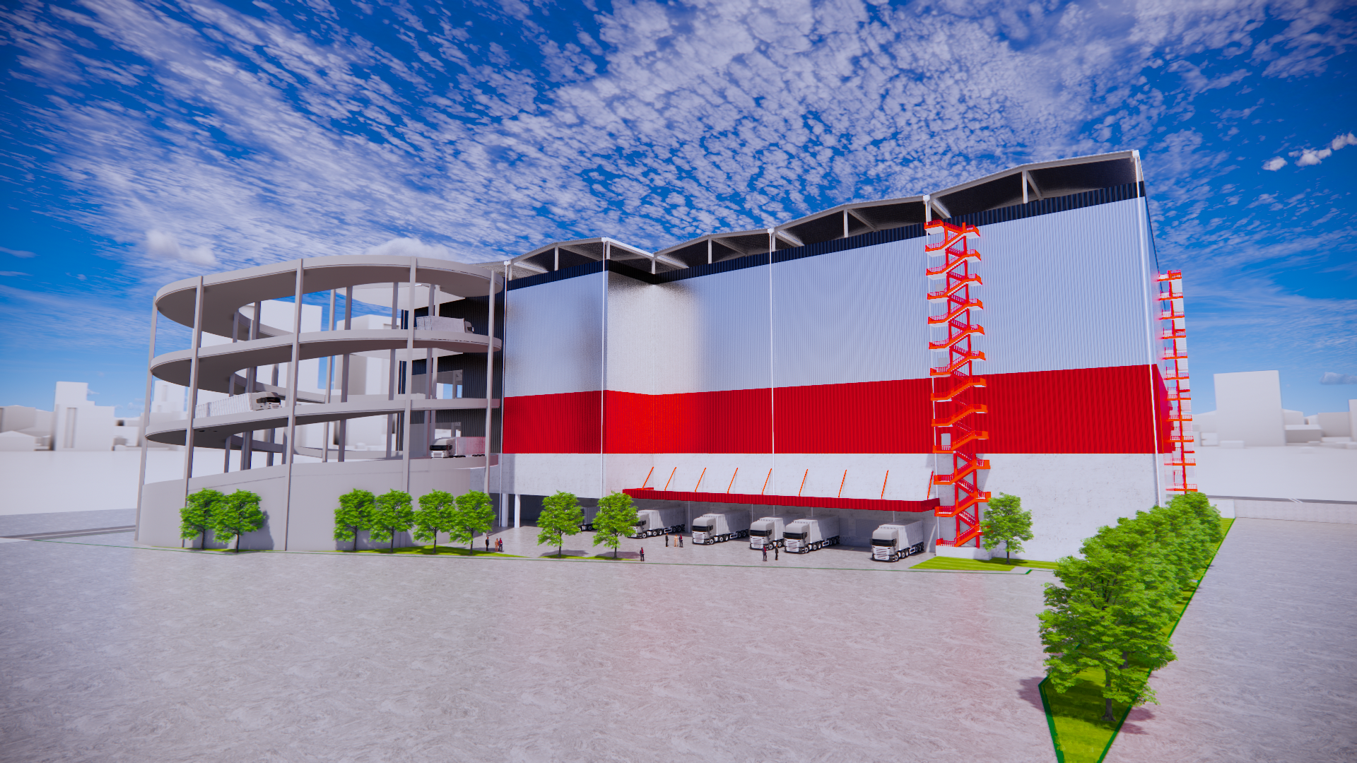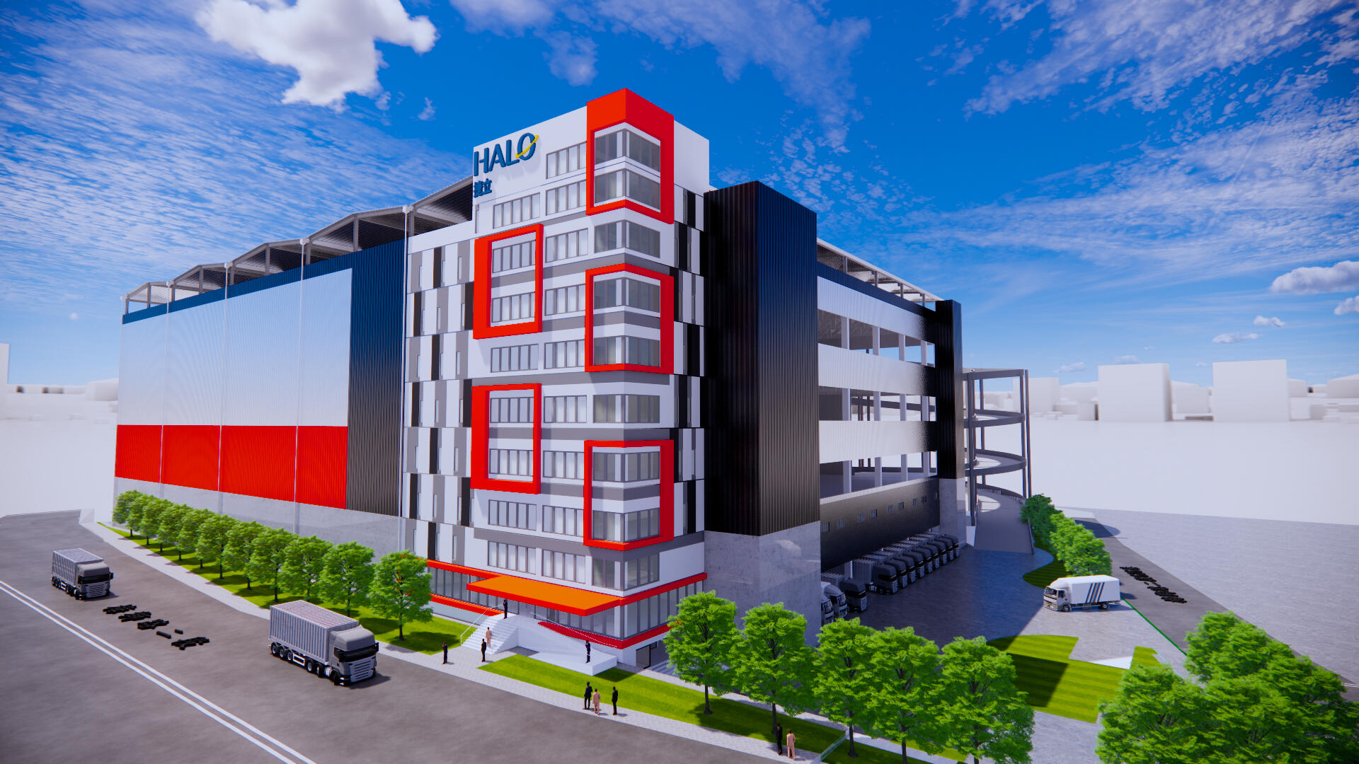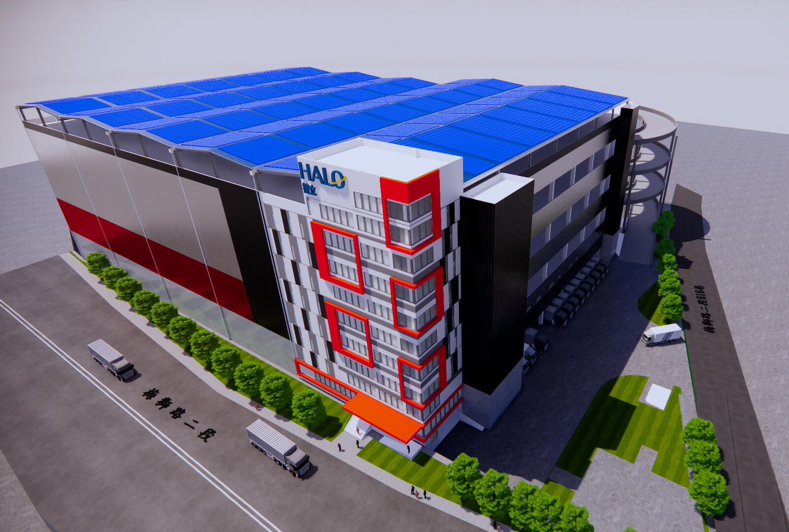 本計画では独立した車路を有するシングルランプウエイ型を採用し、マルチテナントの館内交通需要に対応しています。また屋上には太陽光パネルを設置、施設の使用する電力の約60%を自給する計画です。賃貸区画全4フロアのうち1フロアは小割可能な冷凍冷蔵フロアとして予め実装。台湾のコールドチェーン需要に応えます。