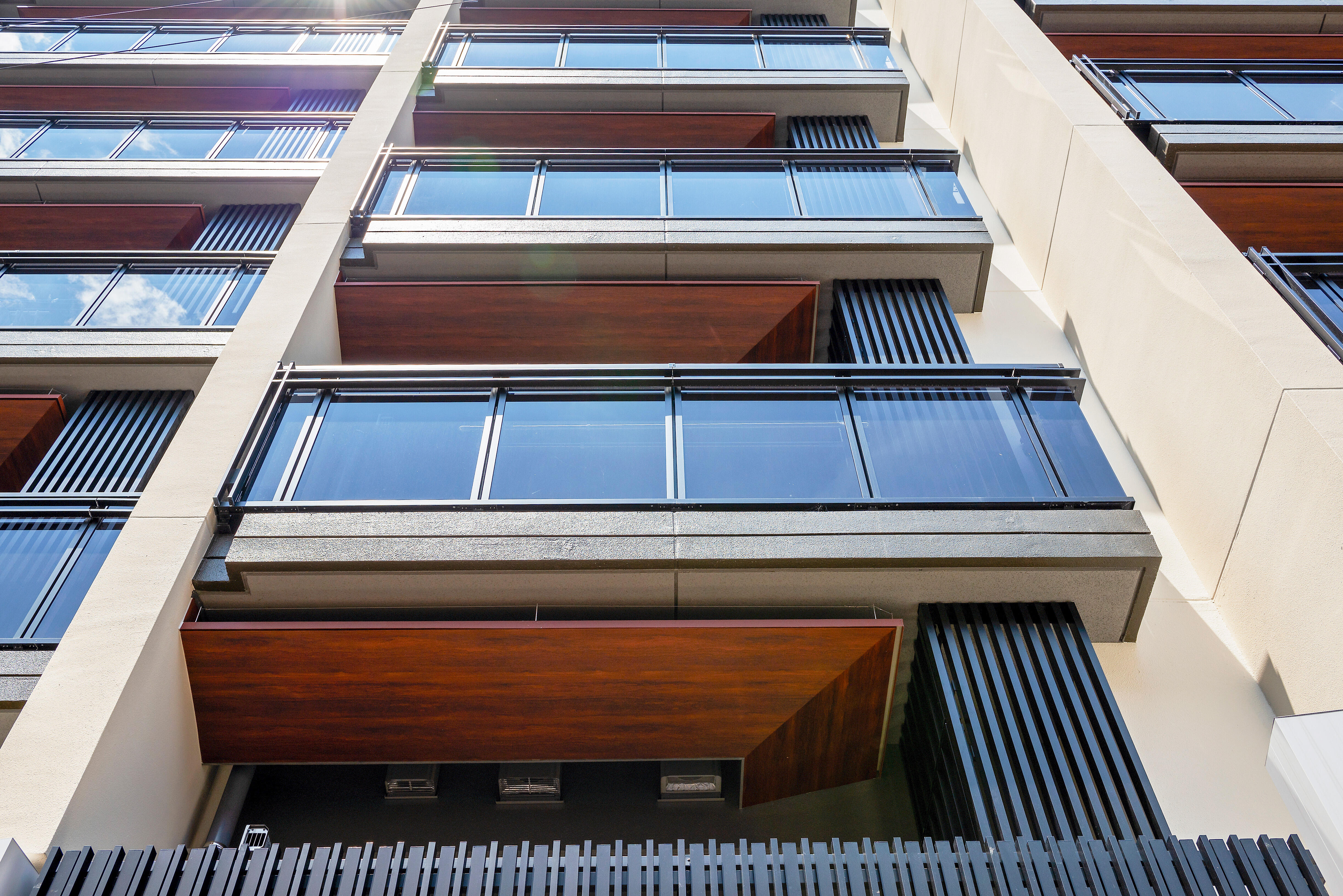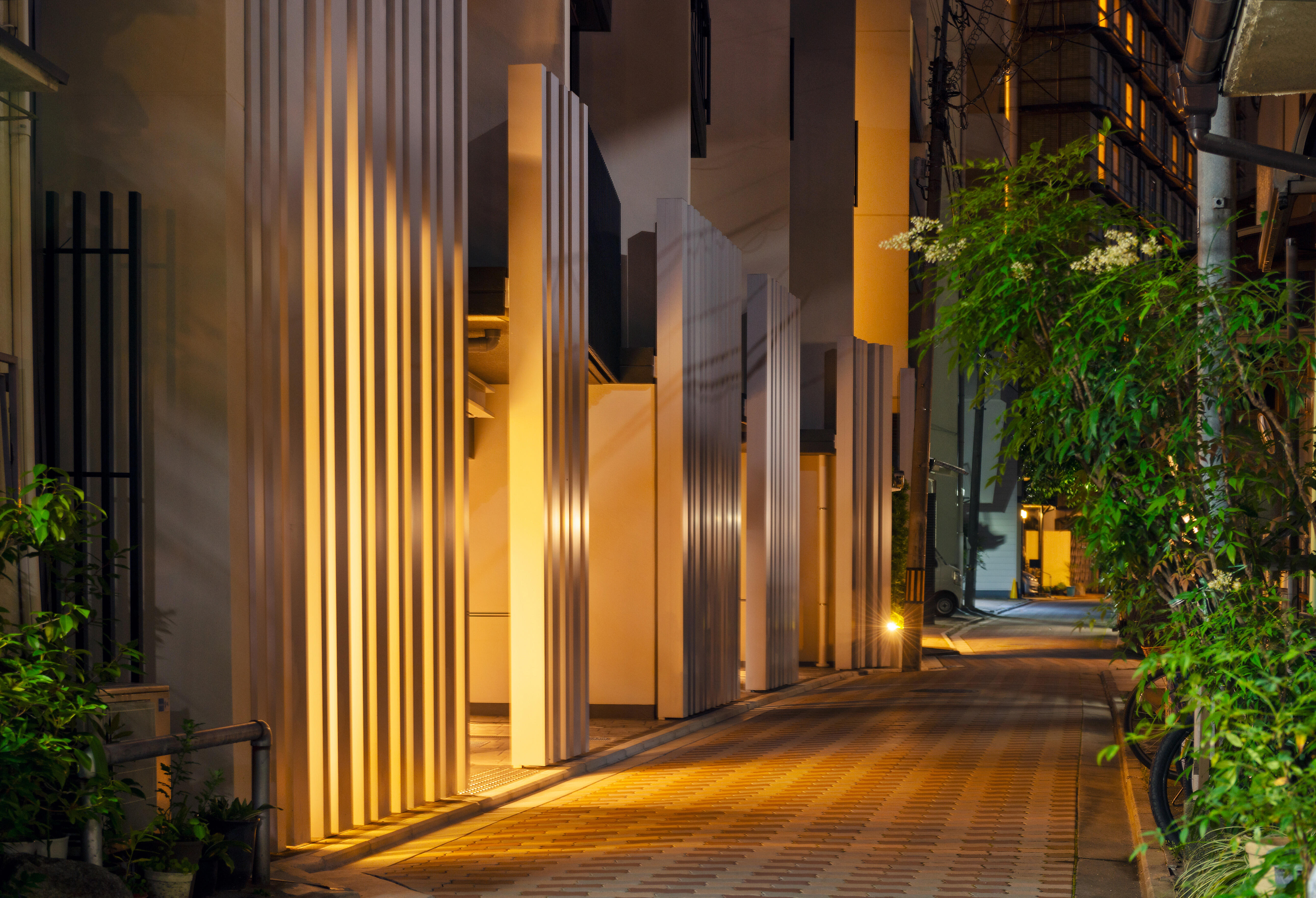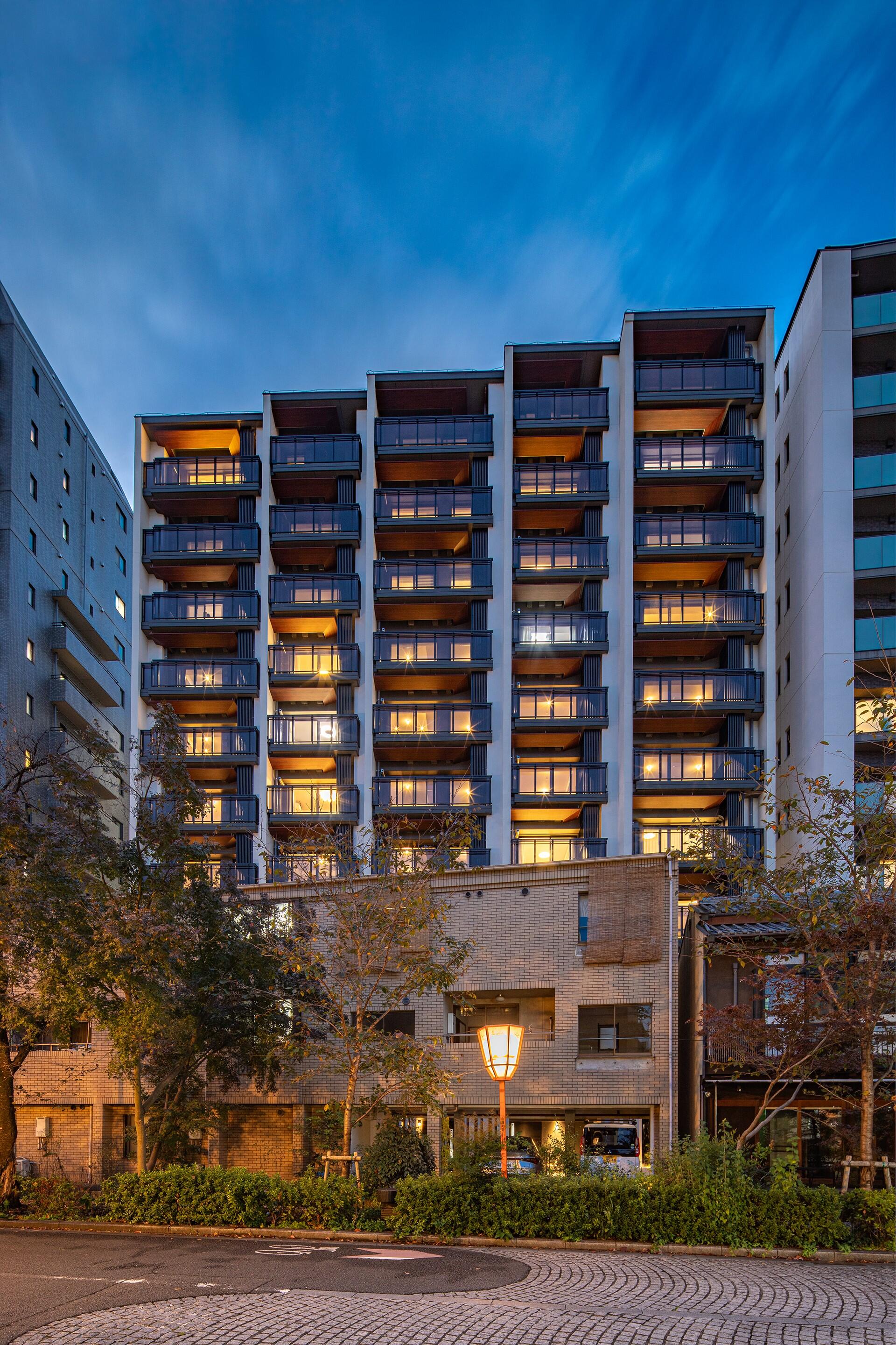 東側の建物形状はバルコニーや内部空間を1スパン毎に雁行配置とすることで分節。周辺に対する圧迫感の軽減を図りつつ、各スパンは町屋の間口に近づけたことで、街並みとの調和・親和性を図った。各バルコニー上部に町屋・寺院建築を参照した木目調の斜め庇を計画。空に向かって斜めに設置をすることで立体感が生まれ、周囲を歩いているひとから建物を見上げたときに美しい表情となり、夜には室内の明かりが反射して木目が柔らかく浮き出るデザインとした。さらに住戸の給排気口を隠蔽するなど集合住宅の生活感をできる限り払拭した。地上部分は一部照明を東側の道路を照らすように設置し、加えて東側接道部分に沿って格子状の列柱を計画。建物のセキュリティの向上及び居住者のプライバシー確保にも配慮しつつ、観光客の往来にも鑑み、夜間の歩行空間の安全性向上を企図した。これらにより、高層集合住宅ながらも京都の景観保全に寄与した。