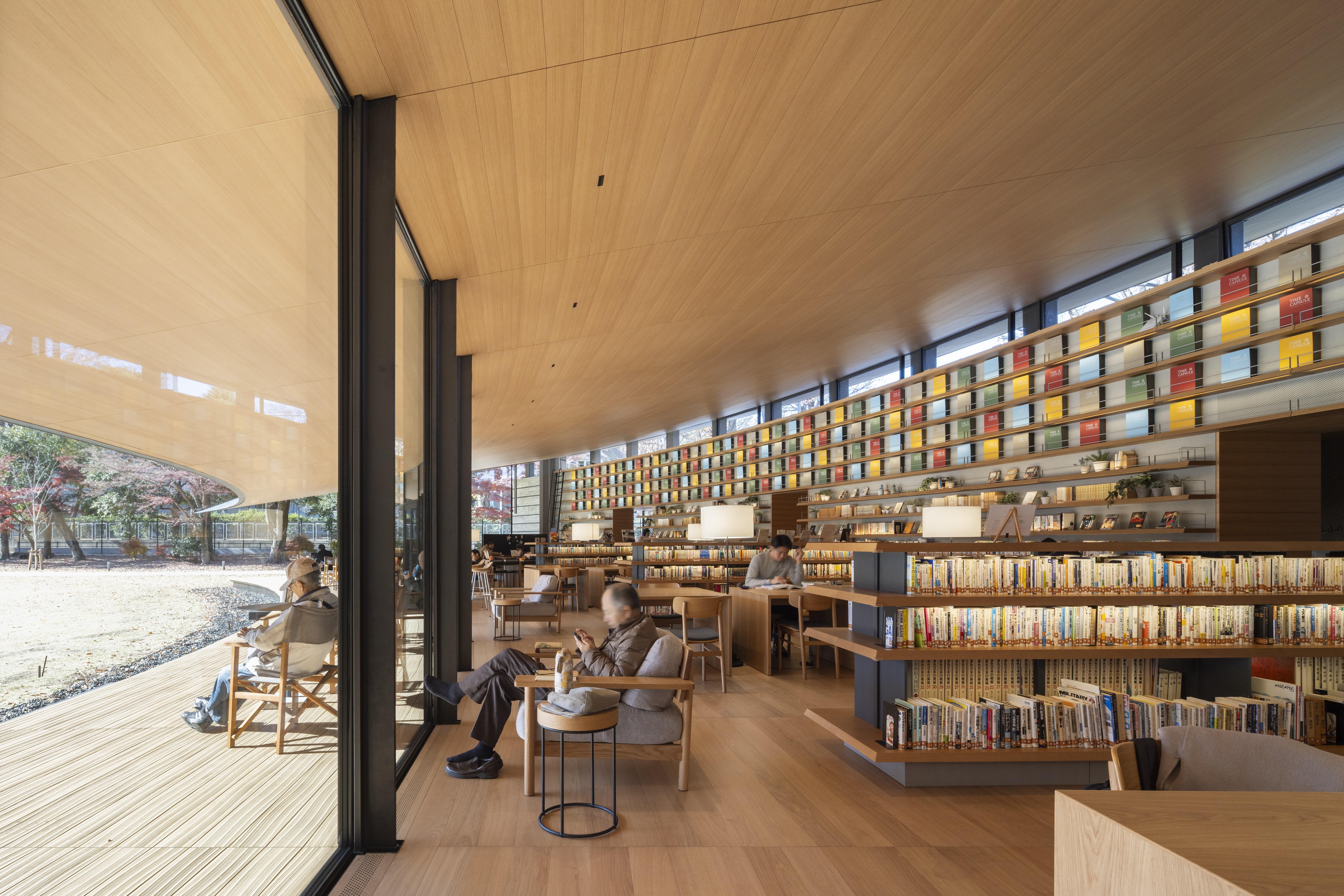 行員専用の交流の場を一般開放するプロジェクト。70年以上守られてきた樹木をできるだけ伐採しないよう施設・園路を配置し、地下水への還元と植物の育成促進のため雨水はすべて地中へ浸透させるなど豊かな環境の継承を図った。また、地域住民の寄贈図書で構成される図書館(ライブラリ)を園路沿いに配置。本を介した地域コミュニティの深まりを図書が集まる「森の本棚」として可視化し、その上に大屋根をかけるシンプルな構成とした。人びとが憩う縁側に架かる深い軒は、屋内への直射を遮ることで本の日焼けを防止するとともに、環境負荷の低減でZEB Readyを取得。貴重な自然に親しみ、楽しみながら地域で受け継いでいく場をつくっている。