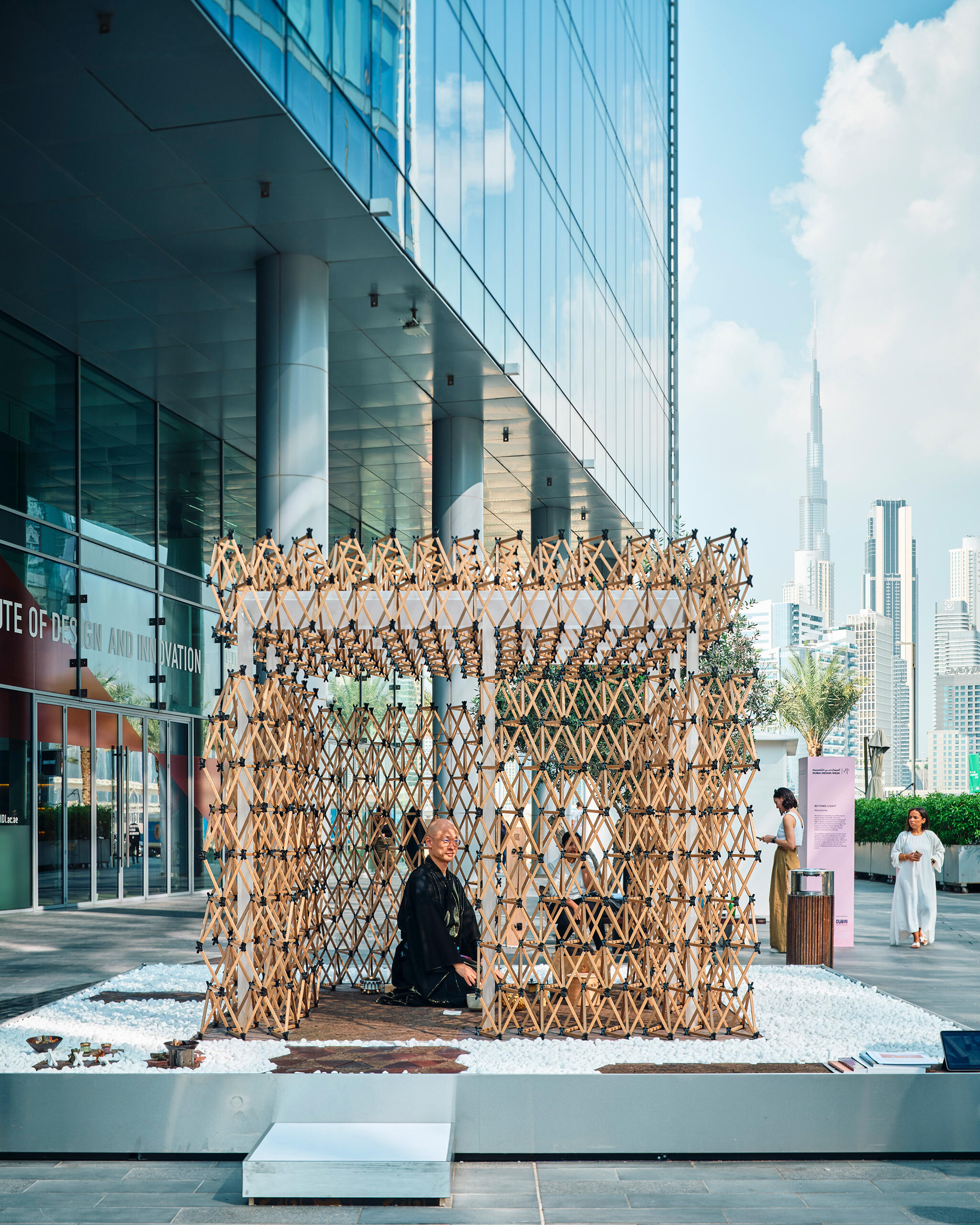 「ベネチ庵」および「アラビ庵」は、2023年、ヴェネチア・ビエンナーレに合わせて開催された「TIME, SPACE, EXISTENCE」展とドバイ・デザインウィークで発表した、世界で初めて食品廃棄物を構造体に用いた茶室の連作。各地域の緯度に基づき日射操作で快適な空間をつくる、グローバルな形態生成アルゴリズムを構築した。世界各地の特色ある食品廃棄物から建材を生成し、「100%土に還る」パビリオンを実現している。小材からなる一連の建材はすべてスーツケースに収納可能で、自主運搬・施工ができるため、輸送・組み立て時のCO2削減にも寄与する。「グローバルとローカル」「資源の循環性」に対するアプローチを具現化した。