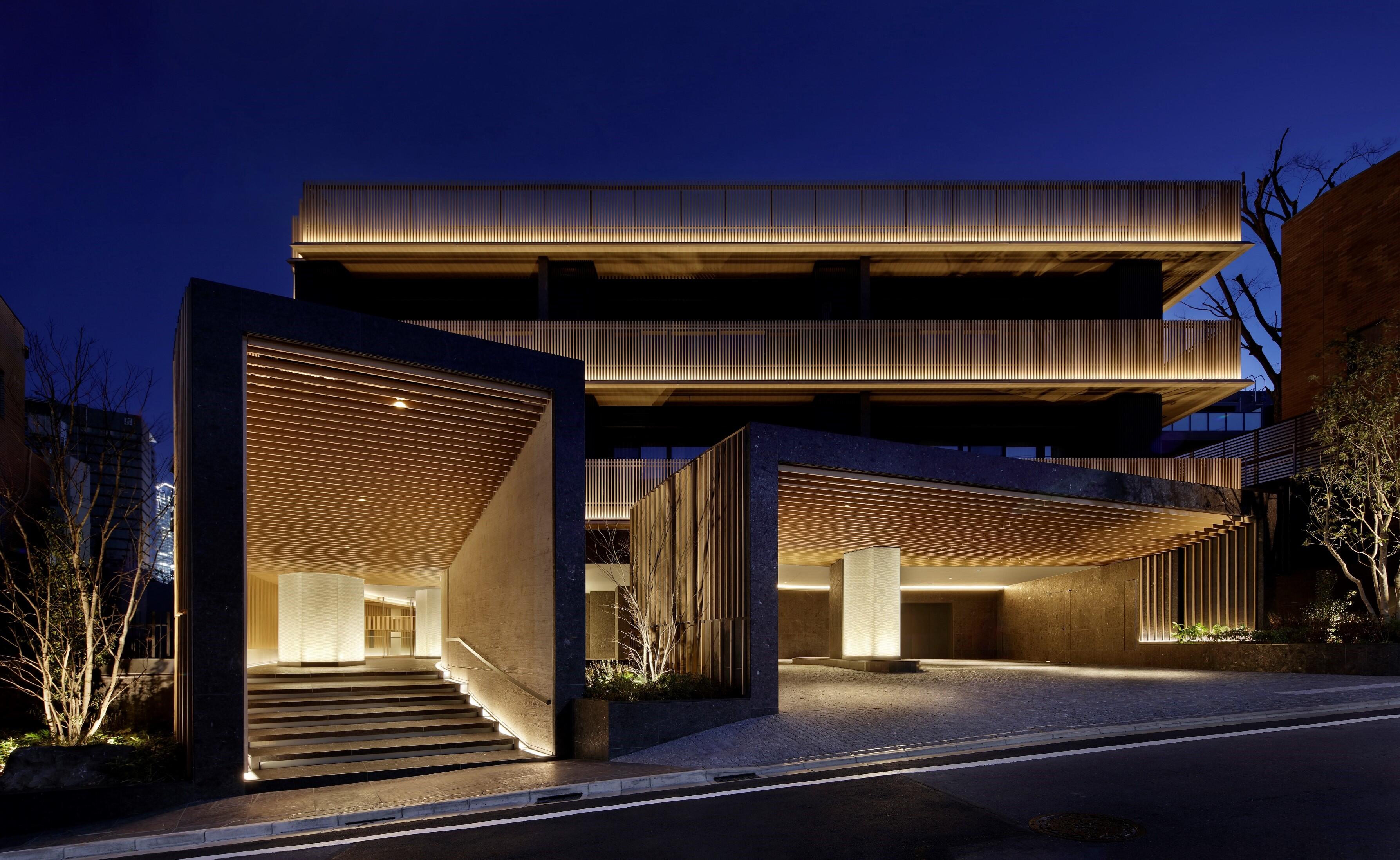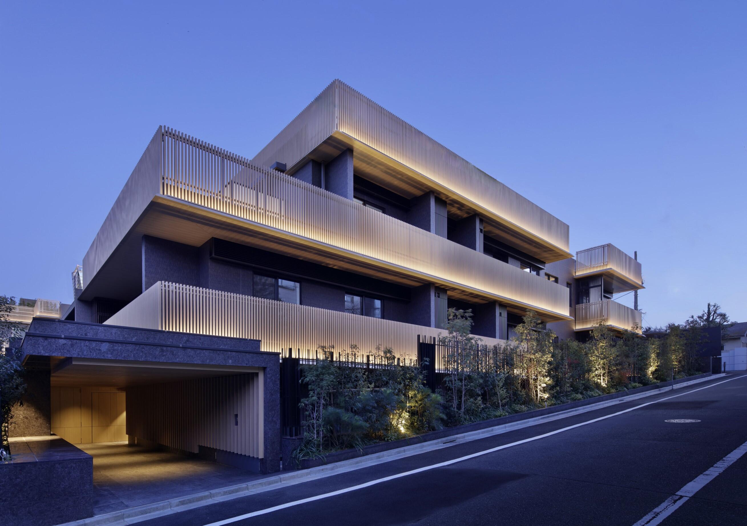 建物外観は、明るい木調の縦格子を暗色の建物外周に廻し、色と透かしの効果で建物を小さく見せ、圧迫感と閉塞感を低減。エントランスアプローチは、光柱の逆光効果とカーブ動線で室内への視線を遮り、居住者のプライバシーを確保しつつ、街に対して開放的な印象の建物とした。建物の灯りで夜の道を淡く照らし、空との一体感を意識して建物上部と空の境界が溶け合うようなデザインとした。周辺建物と相対する要素を取り入れ、デザインによる均衡を追求した。