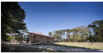 本棚の一望性と低く抑えられた軒から見る武蔵野の森への眺望が、緩やかなカーブ形状によって両立されている。屋根、本棚(と背後の構造壁)、マリオンといった限られた要素を技術的に高度に組み合わせることで快適性と静けさをもたらし、外部からは森に対しての建物の存在感を最小限にしている。木々の保全と雨水の地下への還元の手法など、建てること自体に消極的になりがちなプログラムに対して真摯に向き合い、環境への配慮をひとつひとつ積み上げていくことが建築計画になっていくという今日的なデザインのあり方を示している。