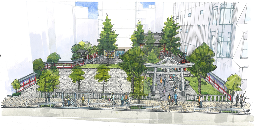 本計画では、東京メトロ東西線「茅場町」駅直結のオフィス、商業および金融拠点の形成に必要な機能などからなる複合ビルを建設するとともに、計画地内の神社境内地を拡張・再整備することで、地域の賑わいの核となる緑豊かなオープンスペースを一体的に整備する予定です。