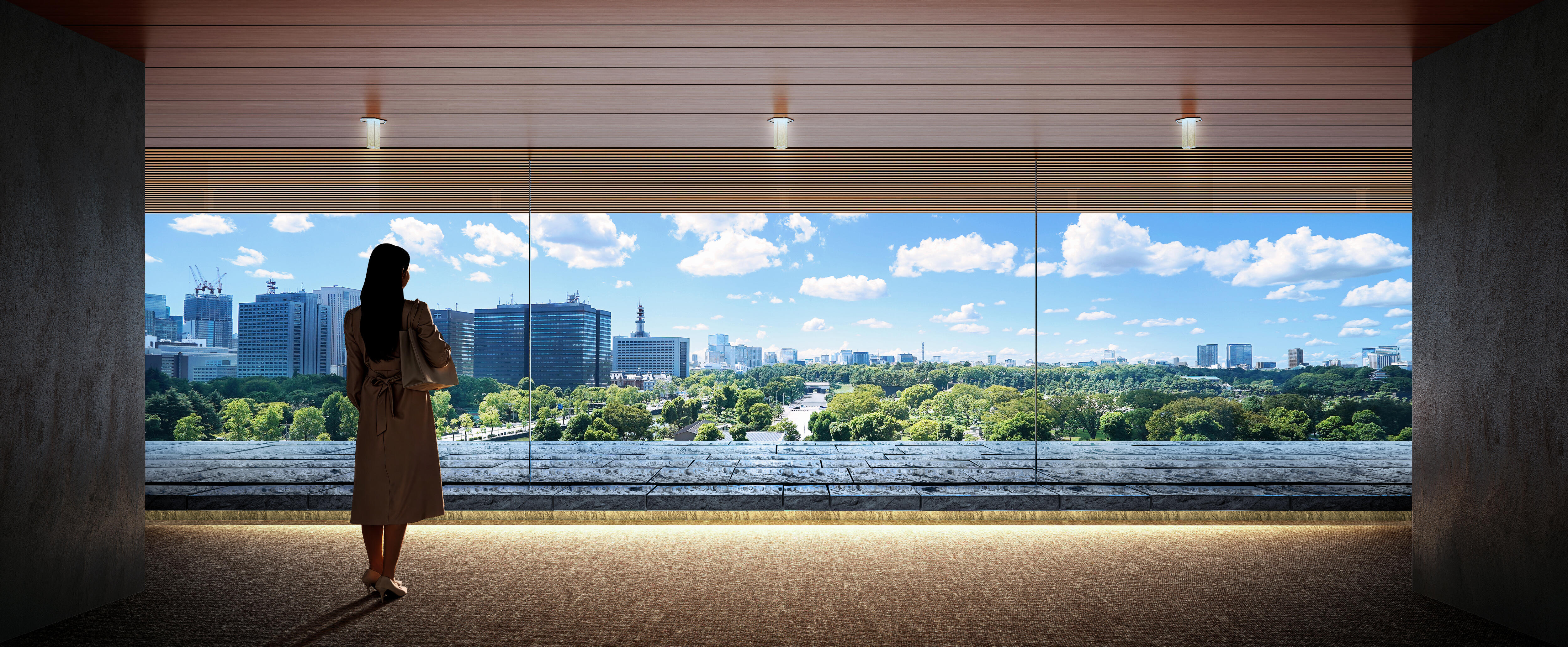 歴史的な31m(百尺)の軒線を継承し、高層部は一定のセットバックを行うことで低層部の既存の軒線との連続性を確保。皇居外苑への眺望を活かした低層屋上テラスを整備することにより、都心の豊かな緑を享受できる自然と調和した空間を提供します。