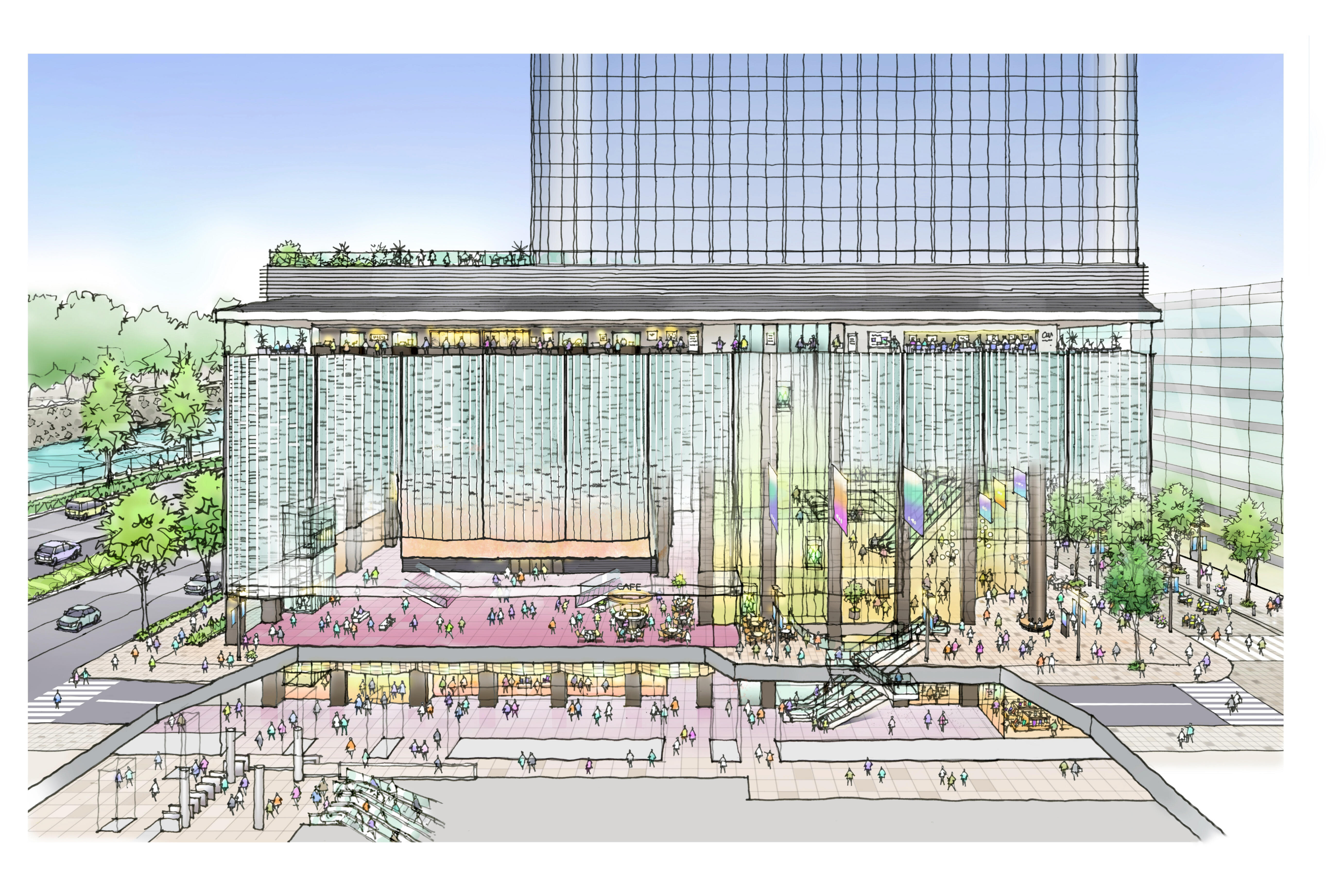 皇居に面するお濠端の眺望を最大限活かし、交通アクセス性、環境性能にも優れたハイグレードオフィスを6階~29階に整備します。大手町・丸の内・有楽町エリアの高度な業務集積を更に高め、東京の国際競争力の向上に貢献してまいります。また、低層部には本計画の特徴である文化芸術機能(劇場・美術館)に加えて、食やショッピングを楽しめる施設を設け、訪れる人々の建物内での滞在価値を高めるとともに、丸の内から有楽町へつながる賑わいを生み出します。