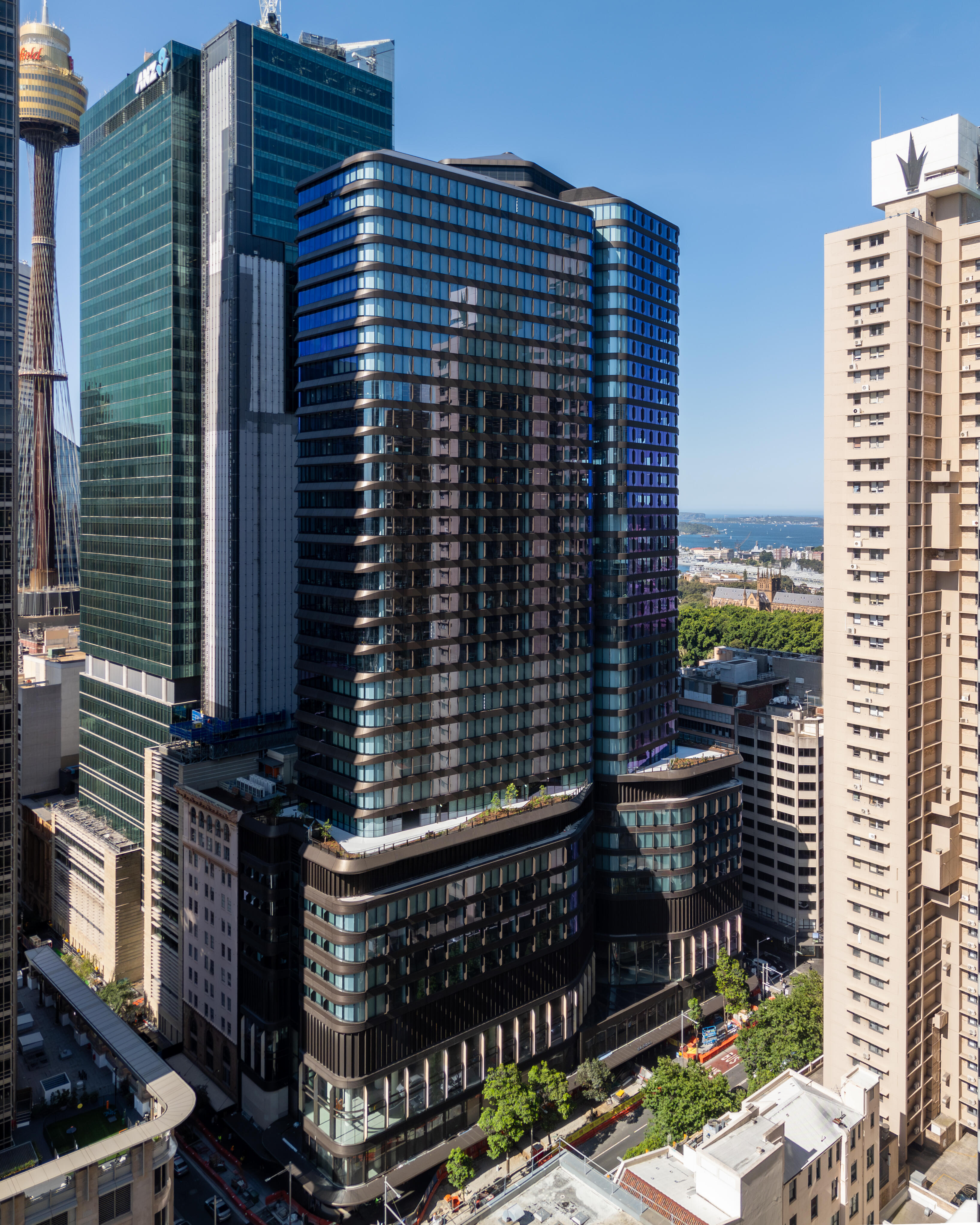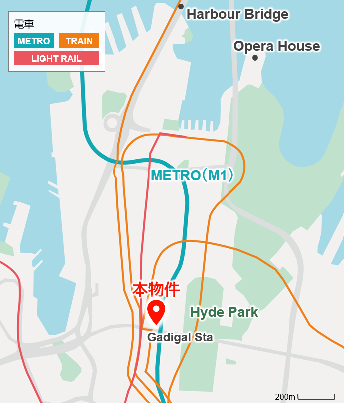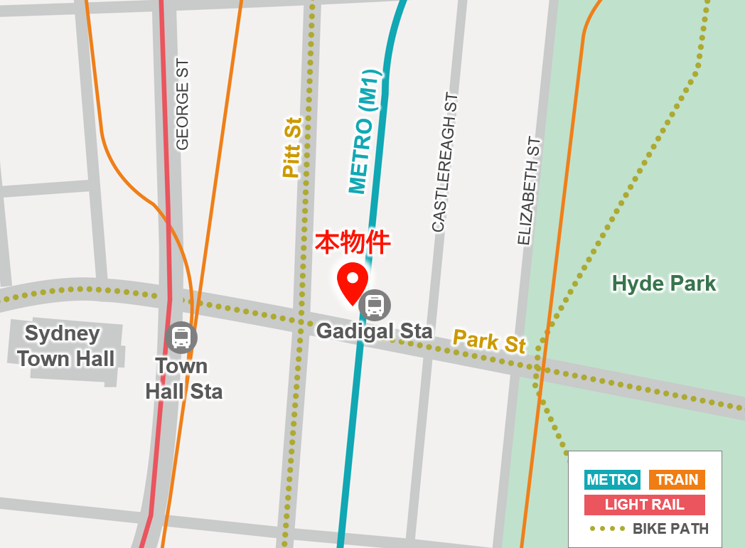 本物件は、シドニーCBDのオフィス・商業が融合した活気のあるミッドタウンに位置し、CBD随一の公共緑地「ハイド・パーク」や歴史的建造物である商業施設「クイーン・ビクトリア・ビルディング」等にも近接しており、アメニティ豊かなエリアでの開発です。また、シドニーCBDを跨ぎ南北の住宅エリアを結ぶ地下鉄シドニーメトロの駅上開発であり、高い交通利便性を有します。