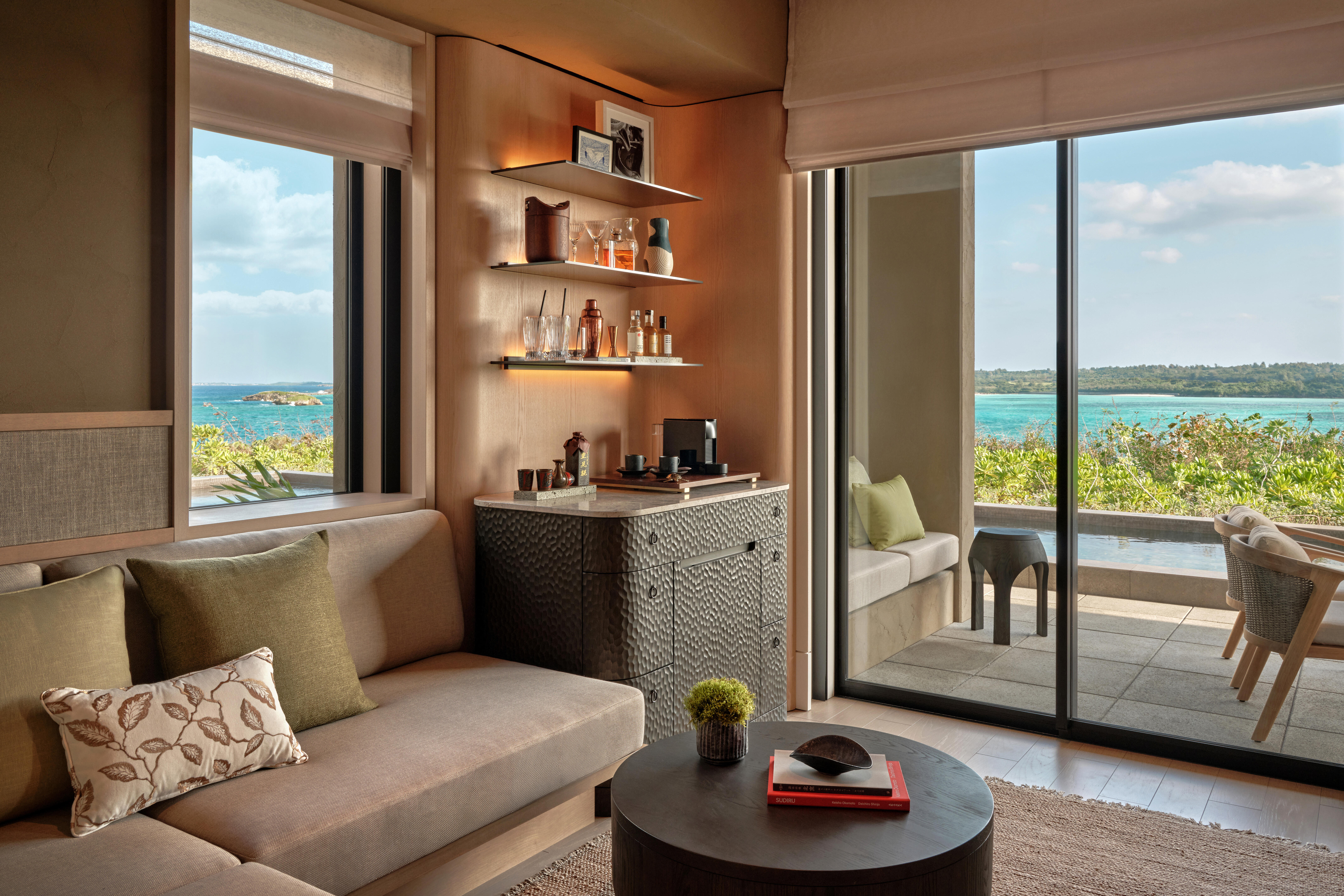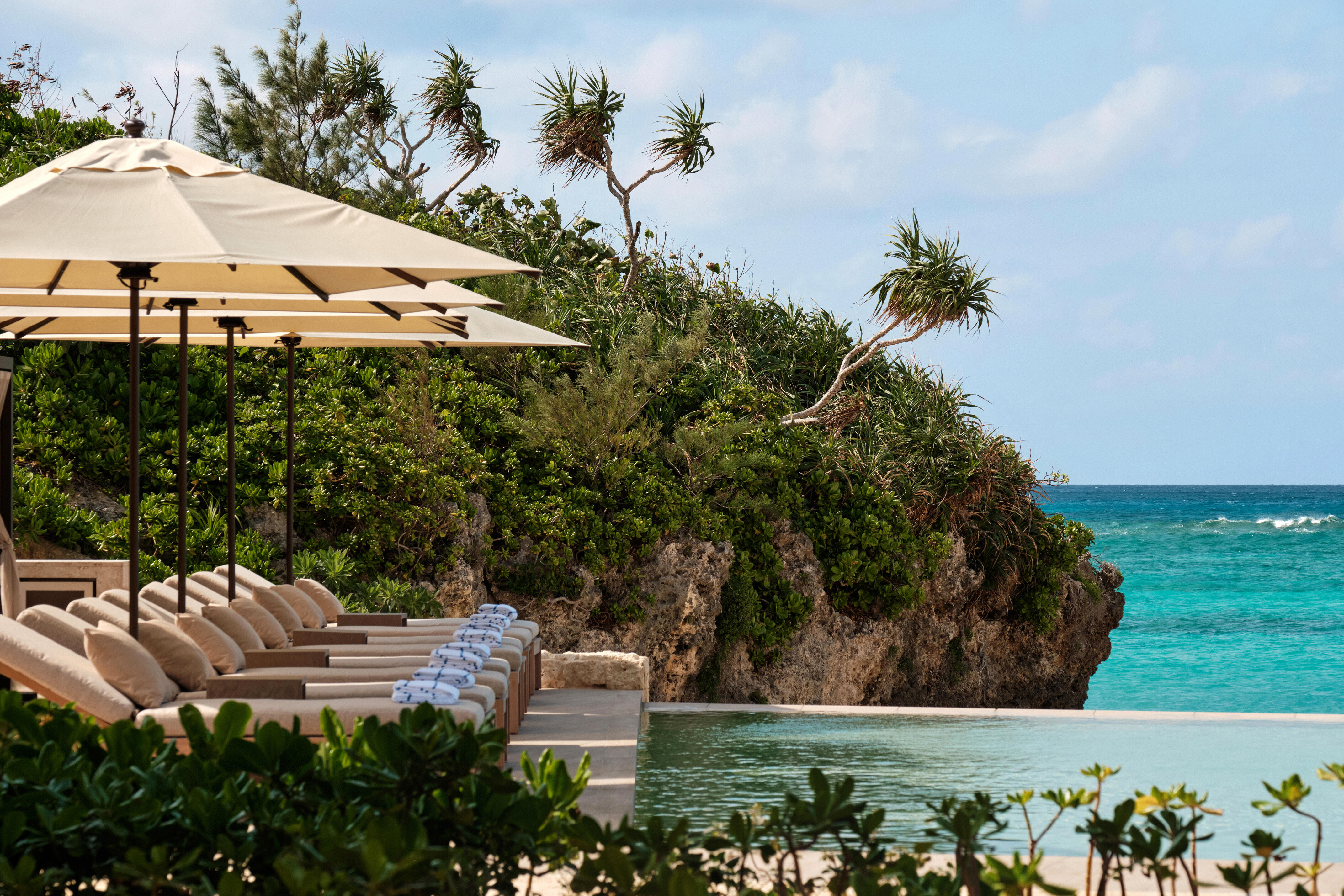 本ホテルは、宮古空港から車で約20 分、下地島空港から車で約30 分に所在する小さな岬に位置します。白い砂浜、岩層、「宮古ブルー」と呼ばれる青い海の自然に囲まれた立地となっており、起伏のある地形を活かし、55 室の客室すべてがオーシャンビューで、プライベートプールとガーデンが設えられています。