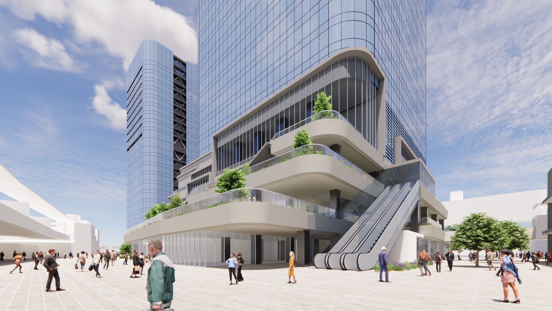 また、本事業では、「国際的な産学連携」、「観光・集客」、「都心居住」に資する機能導入や、周辺道路の歩行者空間化や交通広場の新設等、地域の回遊性向上に資する都市基盤整備を行うことで、国内外から多様な人材が集い賑わいを創出し、周辺地域へ人を促す駅前拠点としての機能強化を図ります。