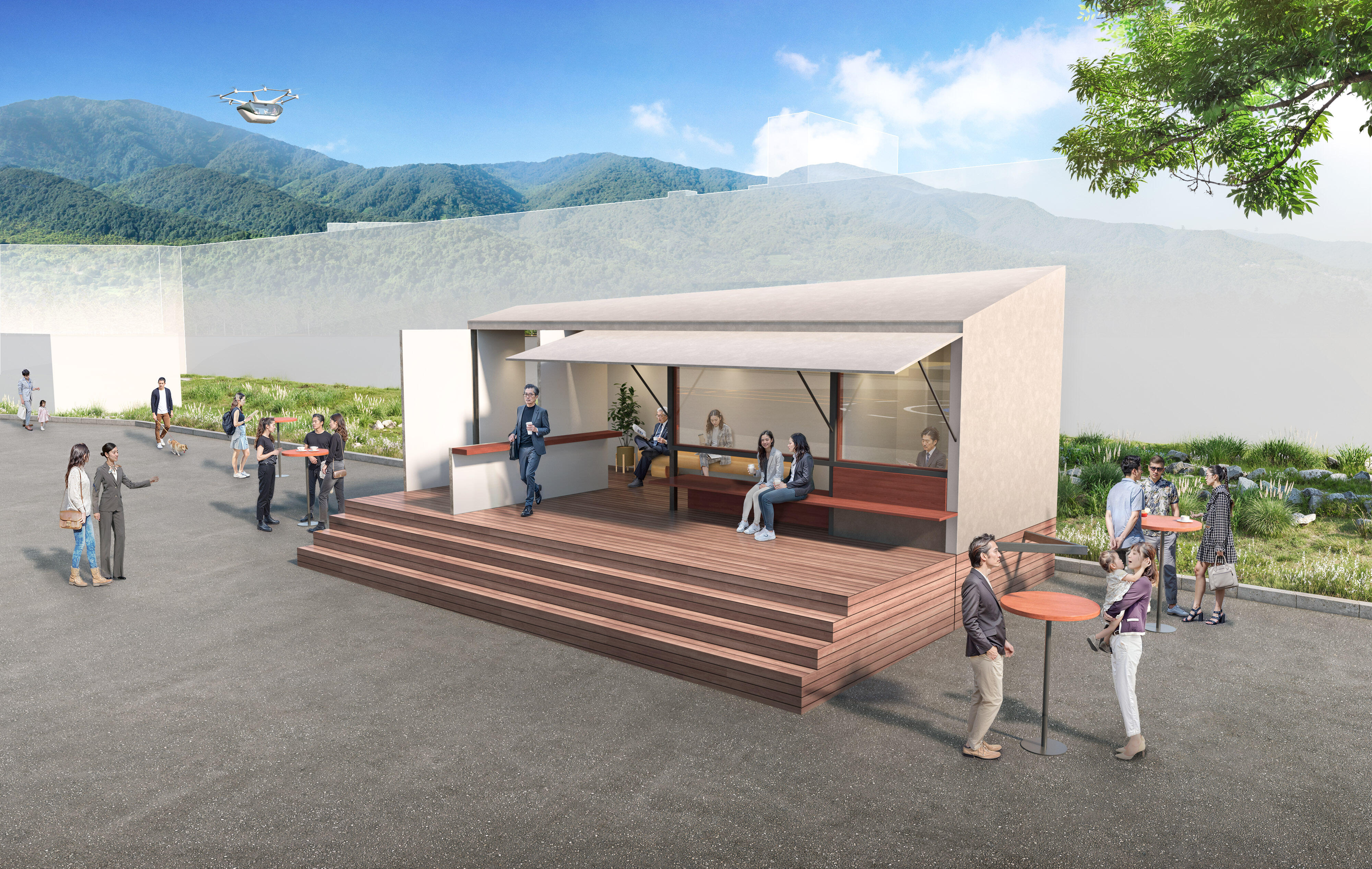 ポートの施設には、空飛ぶクルマの離着陸面に加えて、トレーラーハウスを活用した旅客施設及び運航管理施設を備えるなど、将来的には周辺エリアにおける空飛ぶクルマを活用した運航サービスや遊覧のハブ機能を果たすことを目指しています。なお、本年度秋以降に空飛ぶクルマ実機によるデモフライトを予定しております。