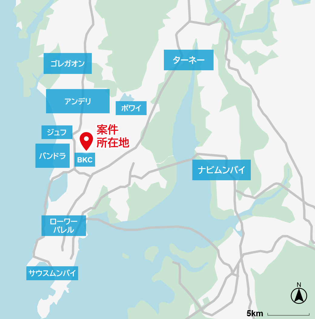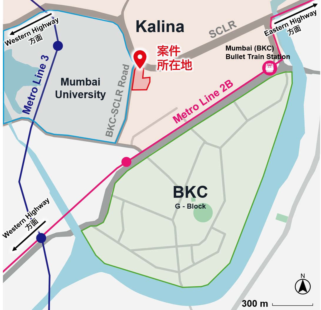 インド共和国マハラシュトラ州・ムンバイ市は、現地主要財閥の本社をはじめ、大手外資企業の統括拠点、金融機関本店、中央銀行、主要証券取引所などが集積する、インド経済の中枢を担う都市です。本物件が所在するKalina地区は、州政府の開発機関※2により整備が進められてきたビジネス・金融拠点BKC※3地区を含む新市街エリアに位置しております。当該エリアは、メトロ※4の新駅や、日本の経済協力のもと建設が進められている高速鉄道(新幹線)※5新駅の予定地から近く、ムンバイの国際空港(チャトラパティ・シヴァージー国際空港)に最も近いビジネス街として知られており、近年、利便性の高さからオフィスや高級住宅等の開発が進んでいます。