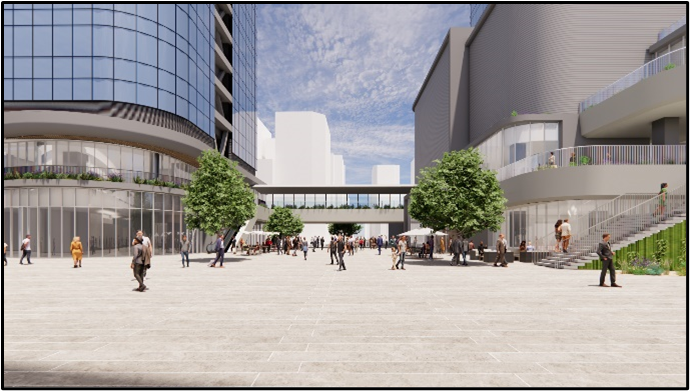 また、本事業では、「国際的な産学連携」、「観光・集客」、「都心居住」に資する機能導入や、周辺道路の歩行者空間化等、地域の回遊性向上に資する都市基盤整備を行うことで、国内外から多様な人材が集い、賑わいを創出し、周辺地域への人の流れを促す駅前拠点としての機能強化を図ります。