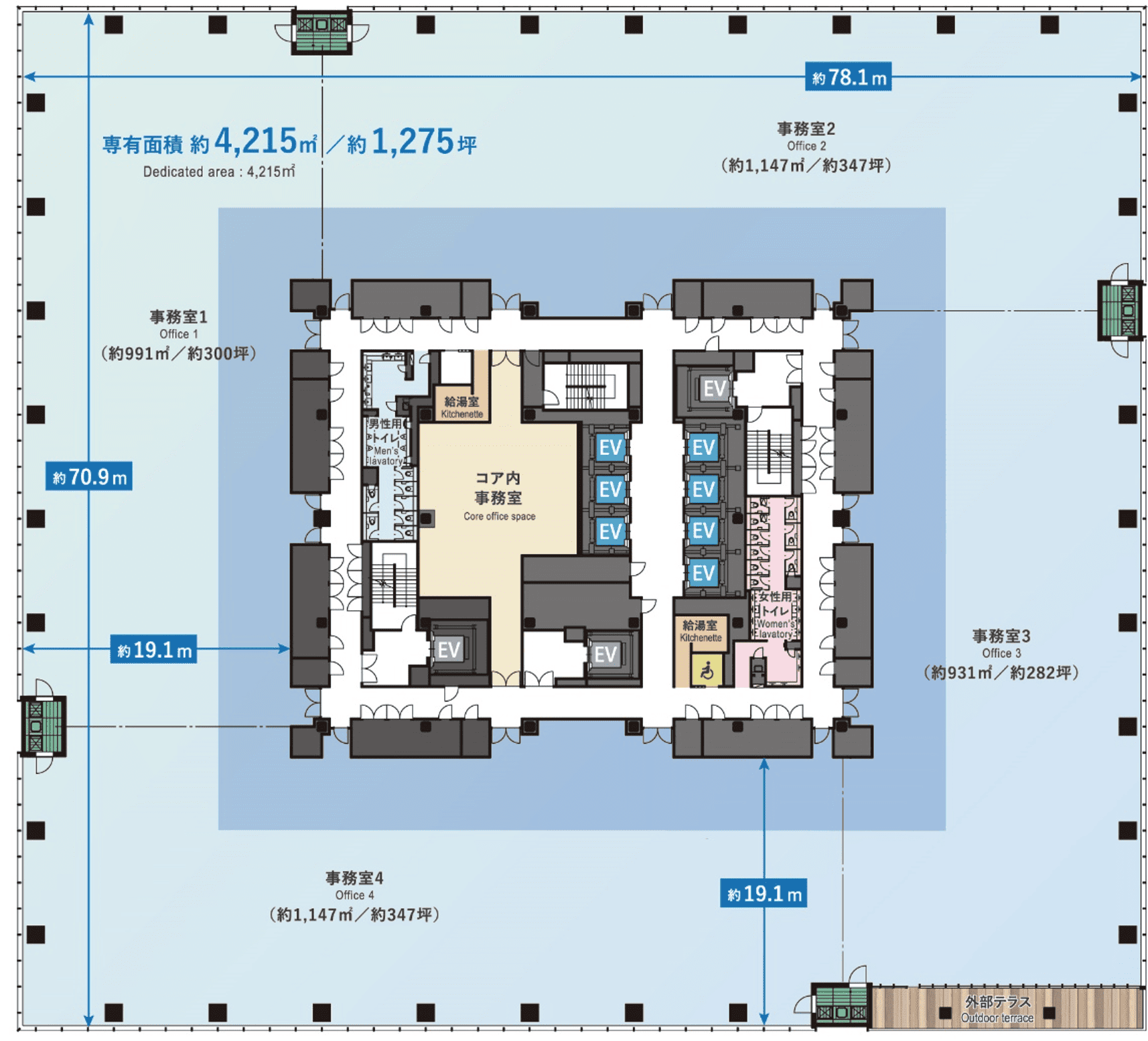 オフィスは4階~15階に位置し、1フロア(基準階面積)は約4,215㎡(1,275坪)で、働き方に合わせた多様なレイアウト構成が可能です。レインボーブリッジを臨む高層フロア(9階~15階)には、テナント専用の外部テラスを設置しており、ワークスペースの延長として利用可能です。環境負荷低減に係る各種取り組みにより、ZEB Oriented(事務所)を取得済です。また、非常時に電力供給が停止した際にも72時間電力を供給する非常用発電機を設置しており、防災にも配慮した建物となっています。