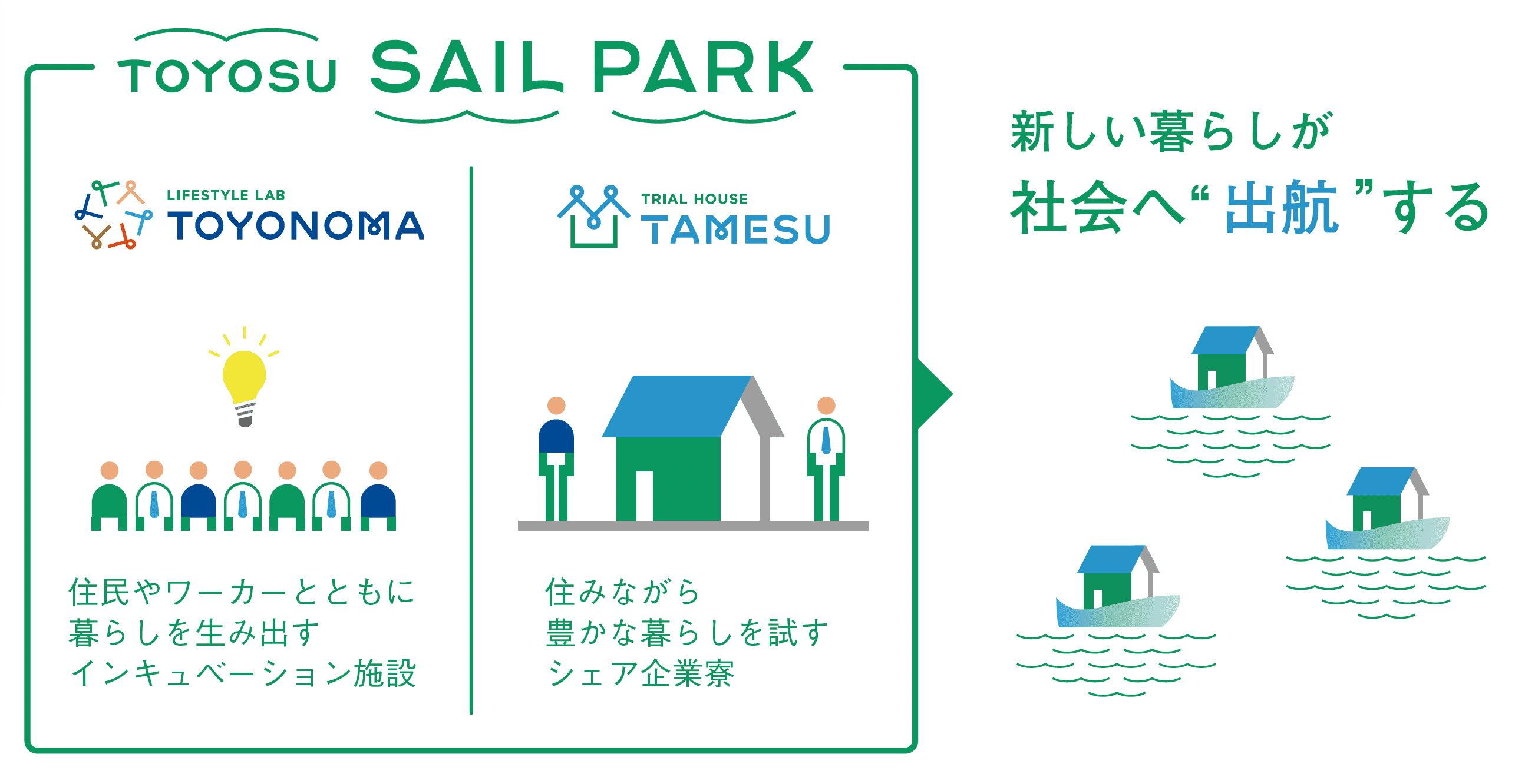 職住遊学が交わる豊洲二・三丁目地区最後の大規模再開発として、インキュベーション施設「LIFESTYLE LAB "TOYONOMA"」とシェア企業寮「TRIAL HOUSE "TAMESU"」を核として豊かなライフスタイルを創出・発信していきます。地域住民やワーカーへのテストマーケティングが可能な「TOYONOMA」で生まれた製品やサービスを、「TAMESU」の入居者が日常的にフィードバックすることで、ユーザー目線が反映された、新しいビジネスが豊洲から生まれていくことを目指します。