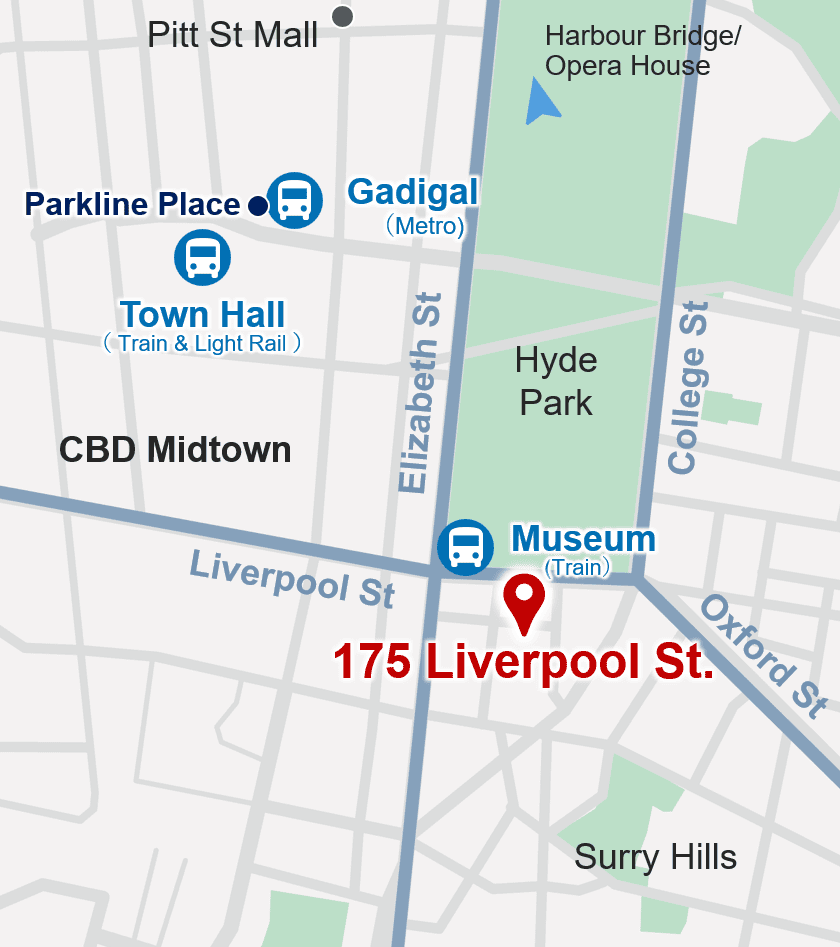 シドニーCBDの南部に所在する住宅を中心とした複合開発プロジェクトです。広さ16ヘクタールの豪州最古の公園「Hyde Park」やオペラハウスを臨みながら、シドニーCBDの中でも商業施設等が充実するエリアに所在します。T3線及びT8線の複数路線が乗り入れるMuseum駅まで徒歩約1分、バス・メトロ・ライトレールの各駅までも徒歩10分という交通利便性も兼ね備えた希少な立地です。本計画の東側にはブティック型の商業店舗が立ち並ぶ目抜き通りのOxford Streetがあり、南にはシドニーの文化的なエリアとして高く評価され、カフェやレストラン、ギャラリーが軒を連ねるSurry Hillsがあるなど、都会と文化の結節点に位置しています。
