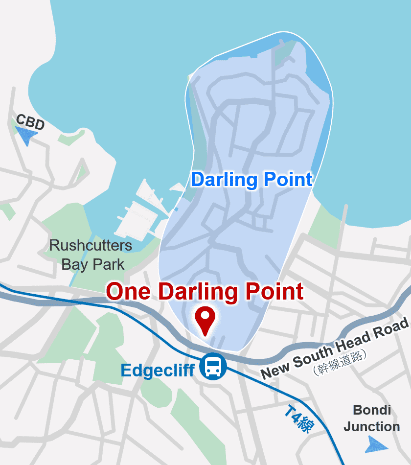 シドニー東部のWoollahra(ウーララ)地区内、古くからの高級住宅街であるEdgecliff(エッジクリフ)における住宅開発を中心としたプロジェクトです。計画地は、シドニーCBDとシドニー東部Bondi(ボンダイ) Junction(ジャンクション)駅を結ぶT4線が発着するEdgecliff駅まで徒歩約1分、シドニーCBDへは車で10分と非常に利便性に優れた立地です。比較的低層な建物が集積する計画地周辺においては、シドニー湾、ハーバーブリッジ、オペラハウス等希少な眺望が得られます。