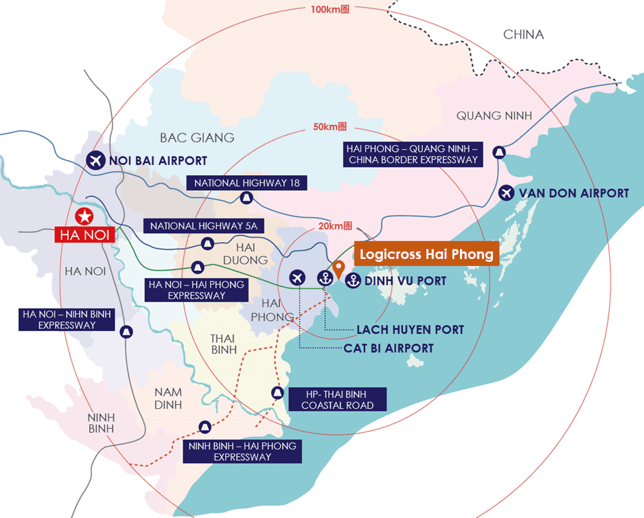 本案件は北部最大の国際貿易拠点であるハイフォン港エリアの物流適地での開発です。日本・韓国・中国・台湾・米国等の外資系製造業の投資が進み大規模な工業団地を多数有する「ディンブー・カットハイ経済区」の中心に位置し、主要高速道路インフラの整備により、北部最大の消費地であるハノイや中国国境へも陸路での良好なアクセス性を有します。