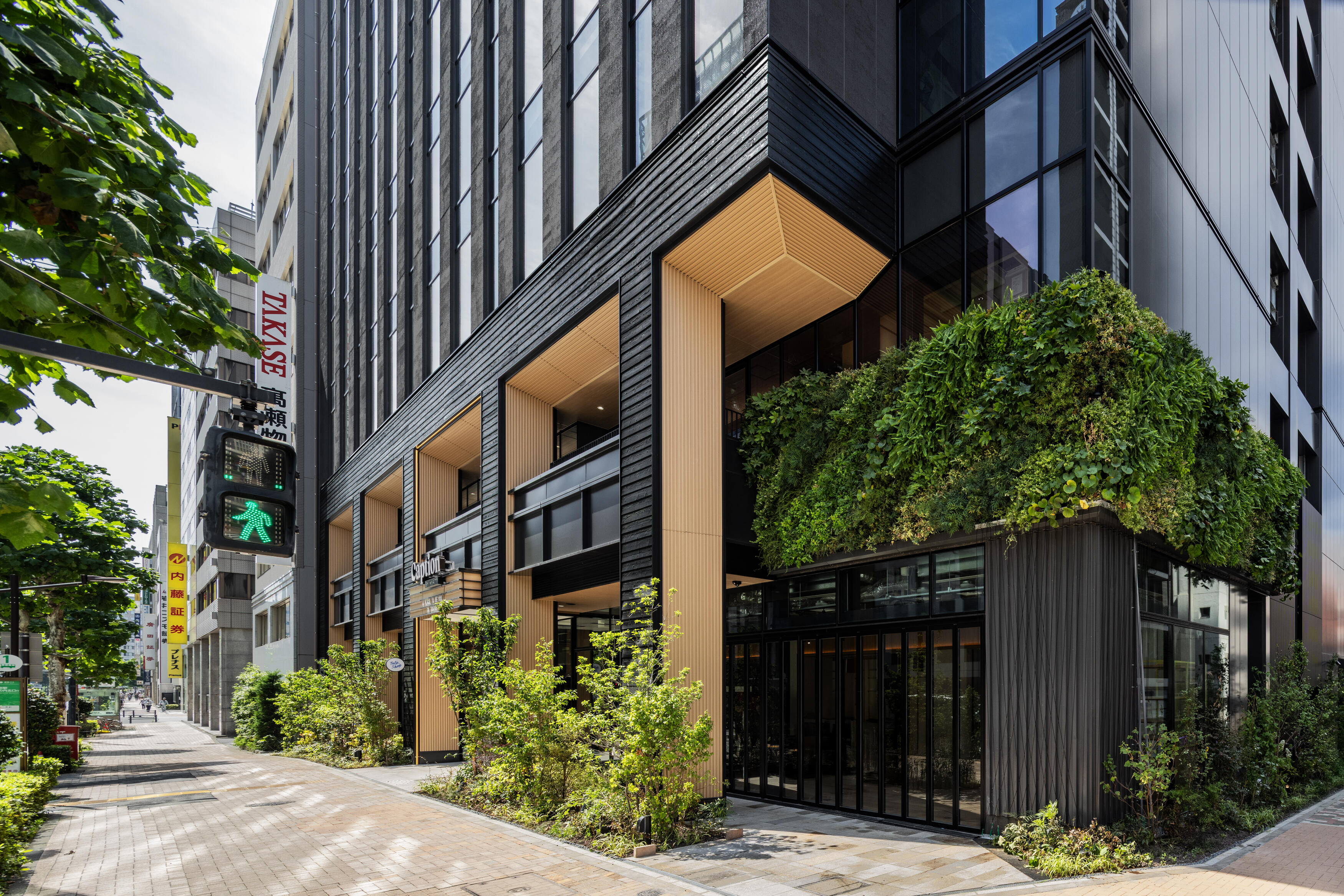 平和不動産が推進する日本橋兜町・茅場町のまちづくりの一環として整備された、歴史ある金融街に新しい文化を融合させる都市型ホテル。主構造は鉄骨造とし、客室フロアにあたる3階から12階の柱と梁の一部に国産木材を使用した木造ハイブリット構造である。柱・梁を木造化するにあたり、負担荷重や階数による必要耐火時間に応じて、現しの木間柱と木質耐火部材を適材適所で使い分けることによって柱の見付幅を統一し、外観に表出される美しい木フレームを実現した。