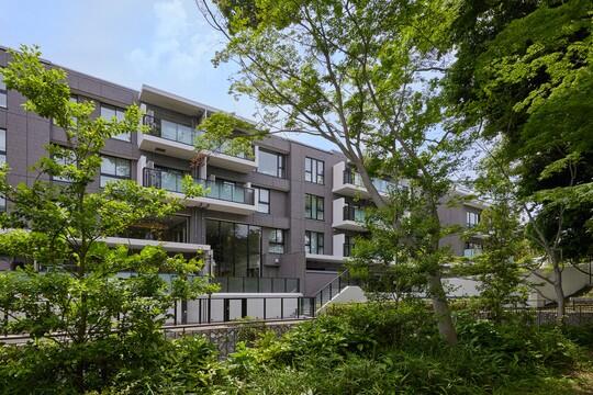 等々力渓谷に位置し東急大井町線に隣接する低層レジデンス。建設地の敷地形状・高低差・自然環境を活用し、線路と建物の間に開放的な空間を創出し、外観デザインと合わせて車窓からの景色を意識した良好な街並み形成に寄与することを目指しました。